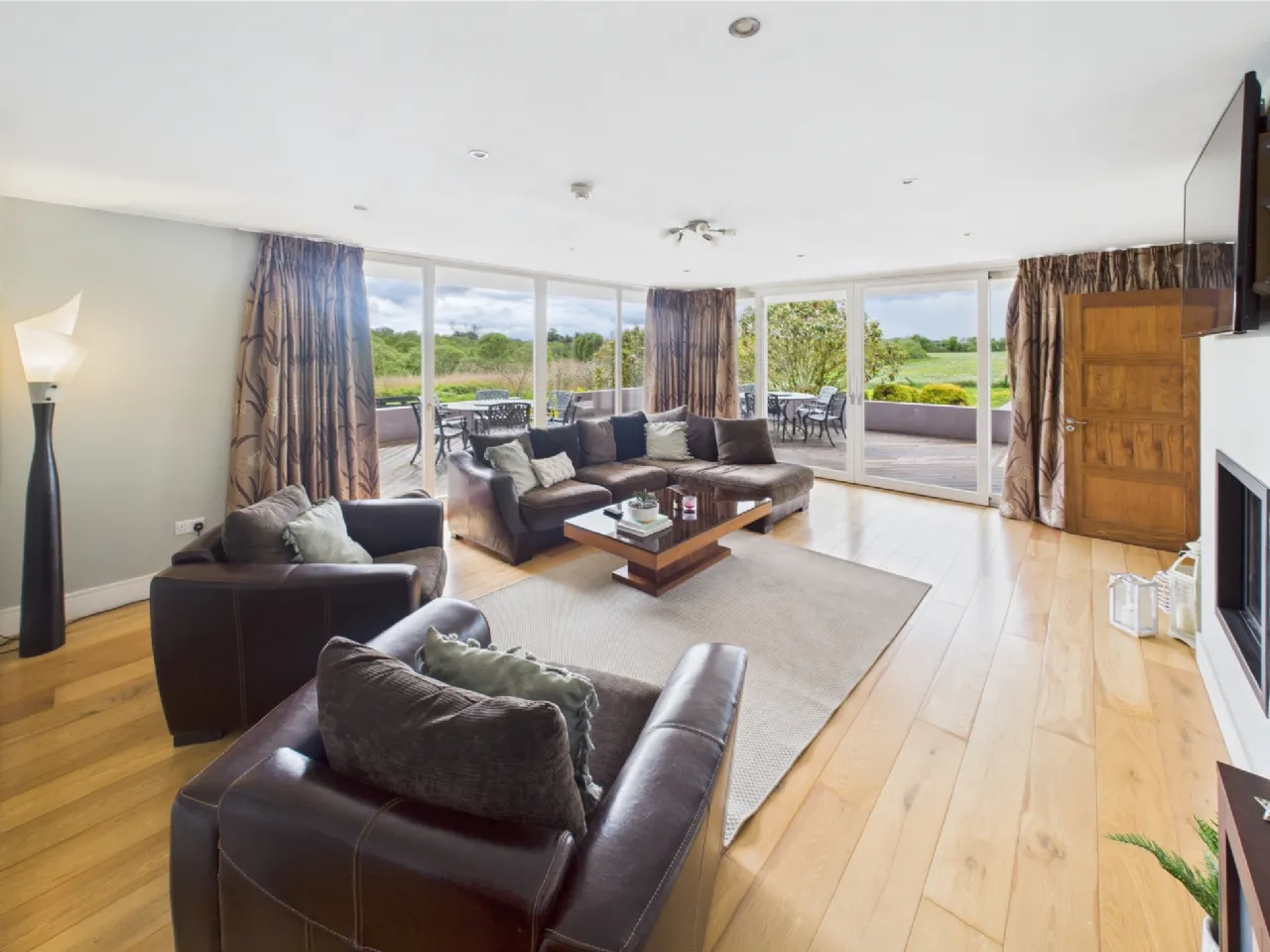 Sitting Room 6.5m x 5.2m with raised fireplace, oak floor & French doors