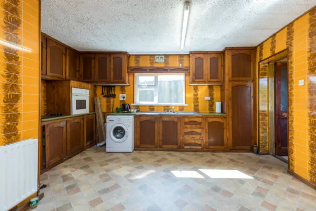 Kitchen/Dining 4.65m x 7.90m at widest point, linoleum flooring, fitted kitchen units, plumbed for washing machine, electric oven and hob and built-in storage units.