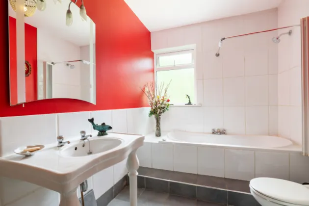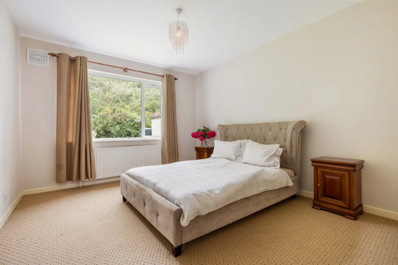 The internal footprint pivots around a central corridor hallway approached through an invitingly large glazed porch, the open-plan livingroom/ dining room affording lovely Sugarloaf views through picture windows. A retrofitted custom kitchen with views to inspire great culinary effort leads out to a bright dual-aspect garden room with quarry-tile floor and walk-in store-room ideal for seasonally stashing garden soft- furnishings. The principal bedroom is impressively laid out to include an ensuite bathroom with the original dressing room re-ordered as a kitchenette with direct garden access; while the three other bedrooms are fine doubles serviced by the main family bathroom.