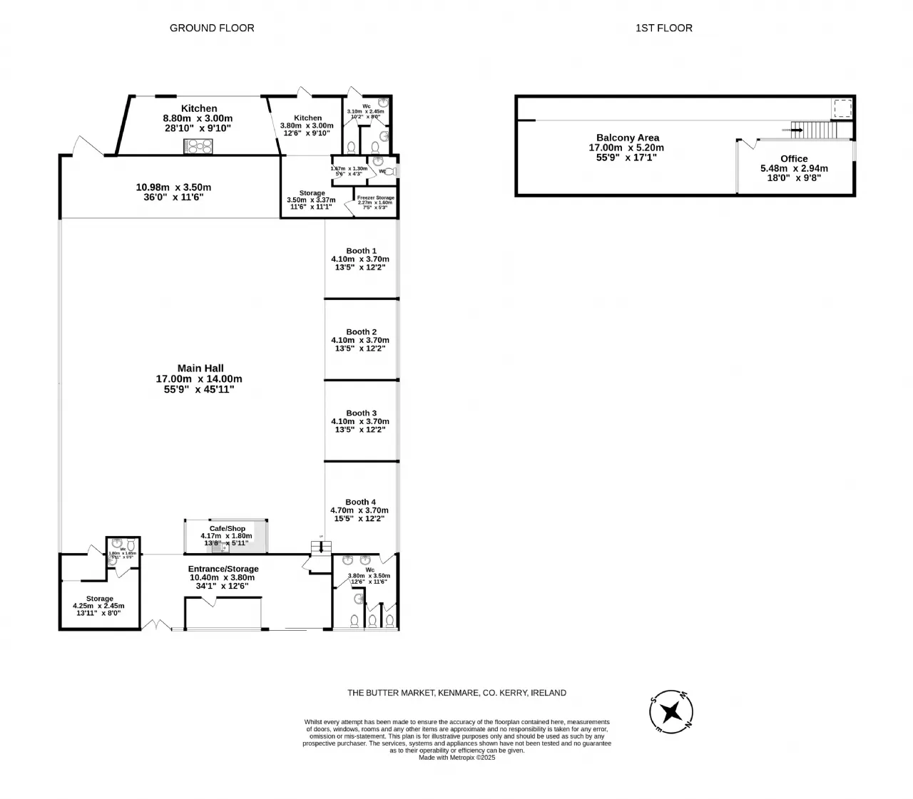 Ground floor: Large Main Hall area with 4 alcoves, storage area, wc area, Retail area along with storage room & wc, catering area which leads to rear yard. First Floor: Balcony with office.