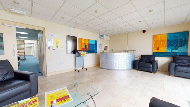 Reception 4.72m x 6.68m with porcelain tiling and glass facade.