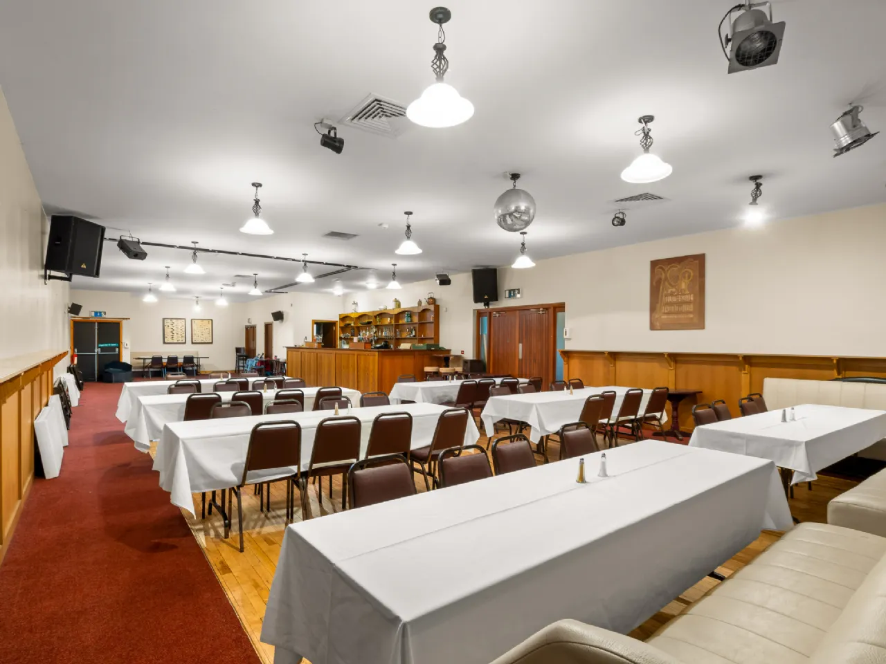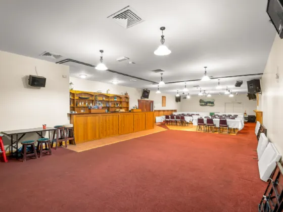 Function Room 7.83m x 21.54m carpeted main floor, tiled around bar, wooden dance floor, bar, stage