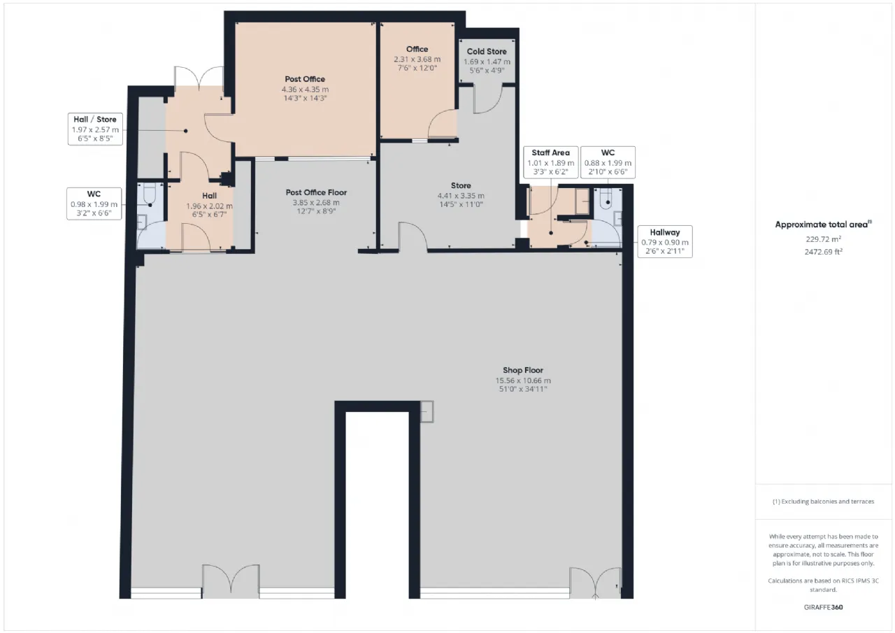 The property measures at 230 sq. m and comprises of a shop floor, store room with connecting cold room, office, small staff area and WC, post office floor,