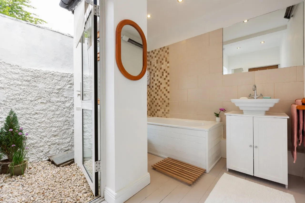 Bathroom 2.61m x 2.76m Wooden flooring, part tiled walls, bath with a handheld shower attachment, wash hand basin, wc, built in cabinets and a window and door to the courtyard.