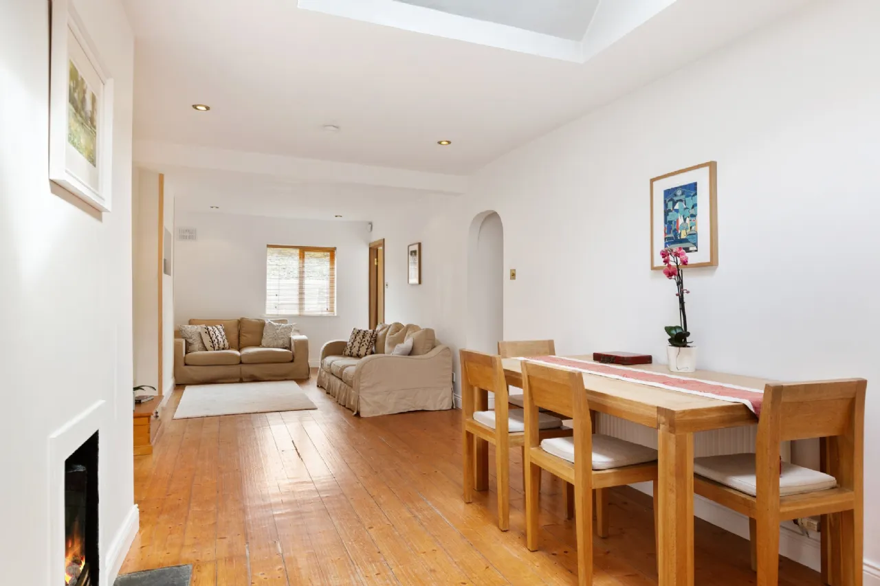 Living/Dining Room Timber wooden flooring, recessed lighting, radiator, gas fireplace with a slate base, Velux window and a hot press.