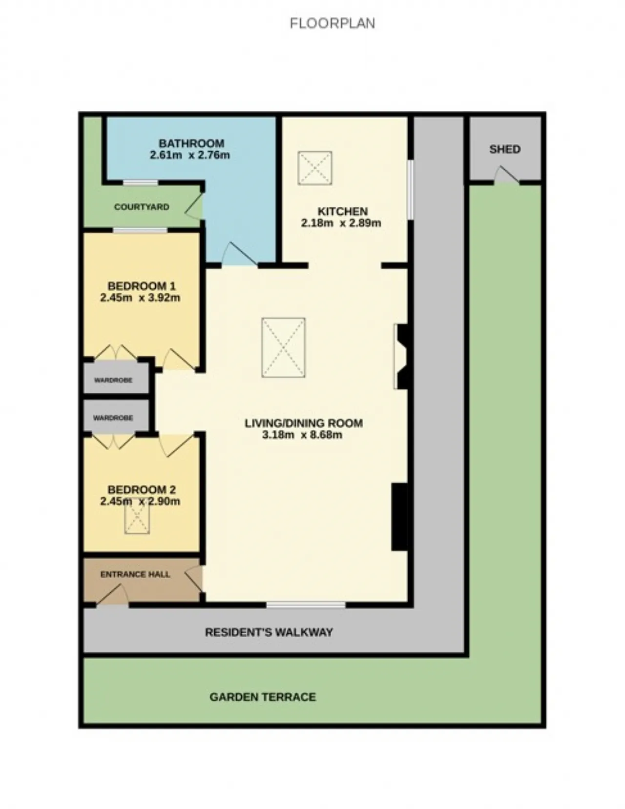 Extending 65 sqm. / 700 sq. ft (approx.) the accommodation briefly comprises a generous living/dining room, kitchen, bathroom which provides access to the rear courtyard and two generous double bedrooms. The property further benefits from a block built gardening tool shed and a wraparound raised gravelled garden terrace, perfect for al fresco dining.