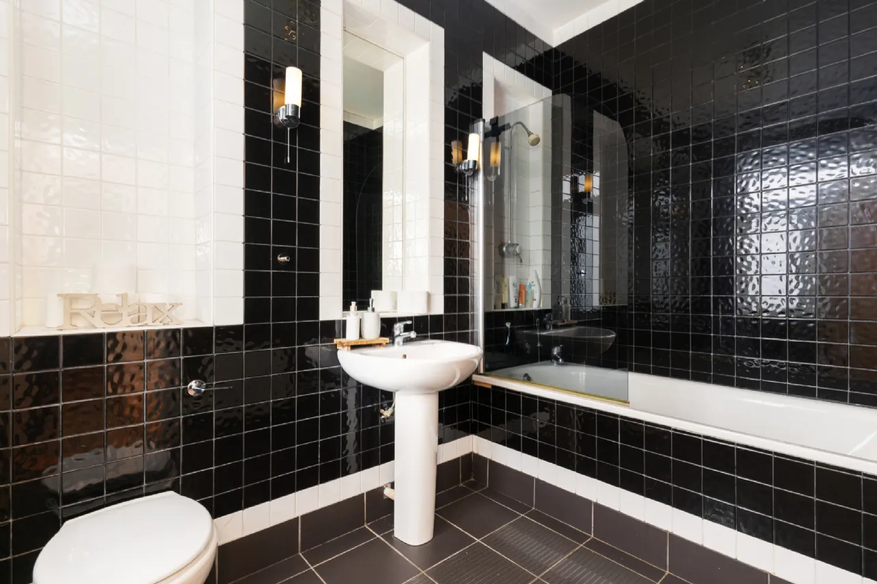 Bathroom 2.79m x 1.93m Tiled floor and walls, window with privacy glass, wash hand basin, bath with shower and glass screen, wall lights.