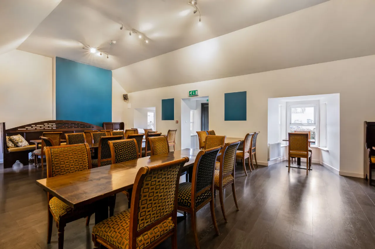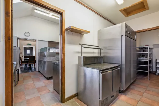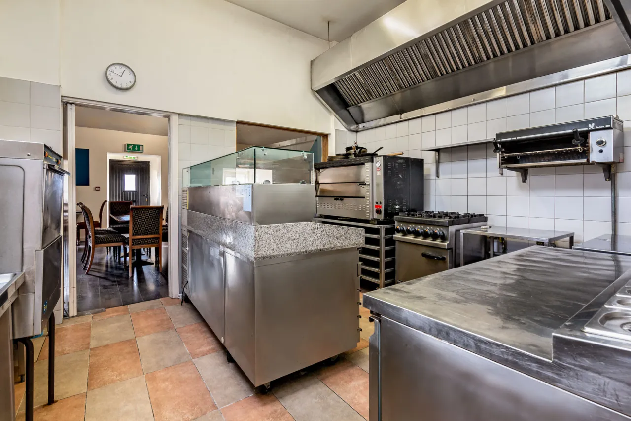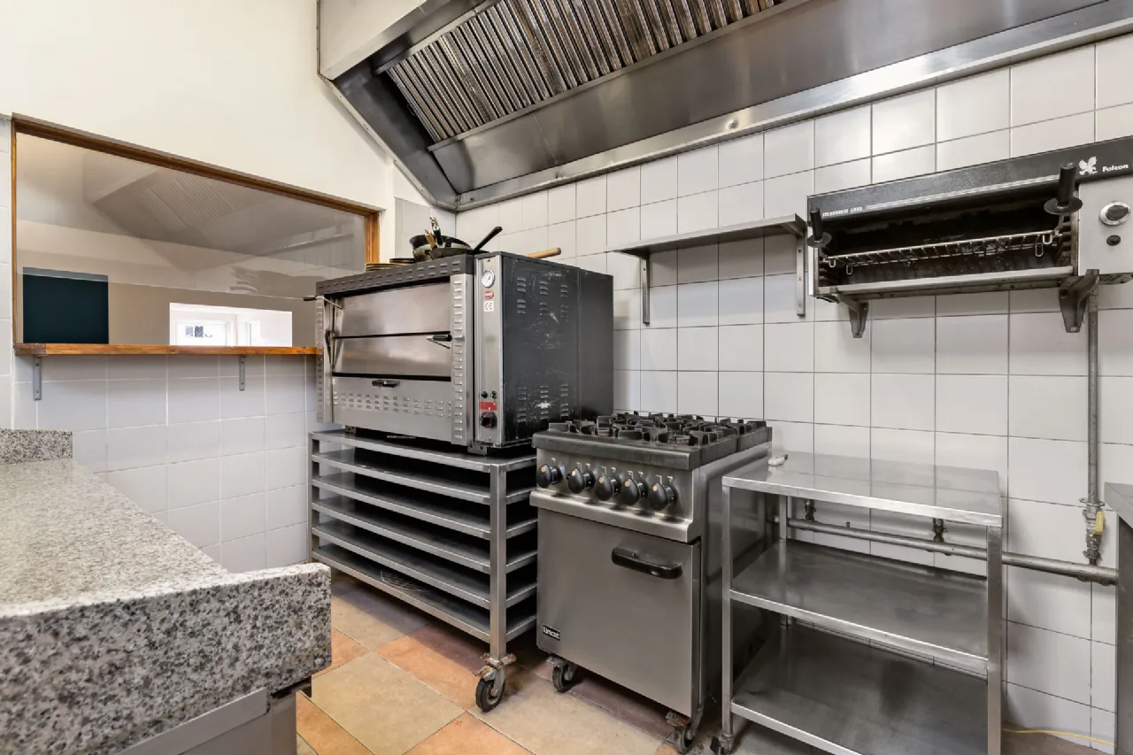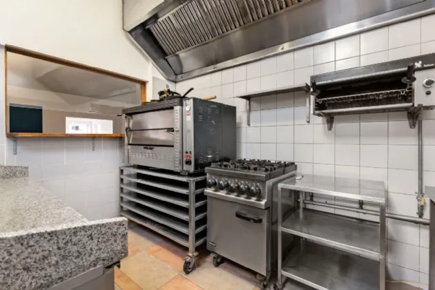 Catering Kitchen 4.32m x 3.71m High quality Catering kitchen fully fitted with double oven baking, breads, pastry, prepared dishes, Pizza. Refrigerated table with granite work top, fridges with small container and mini storage section. Separate dessert marble topped refrigeration dessert salad counter or pastry prep, with instrument drawer and on top, 11 refrigerated service dishes and glass servicing area. Large, powerful extraction hood, 4 burner gas cooker, catering sink, staff stainless steel handwash basin, dishwasher, coffee grinder and coffee machine, large bread mixer for a variety of breads from sourdough to a variety of flatbreads and pizza.