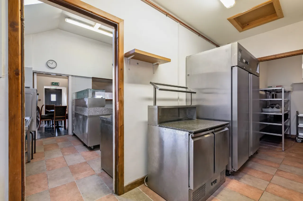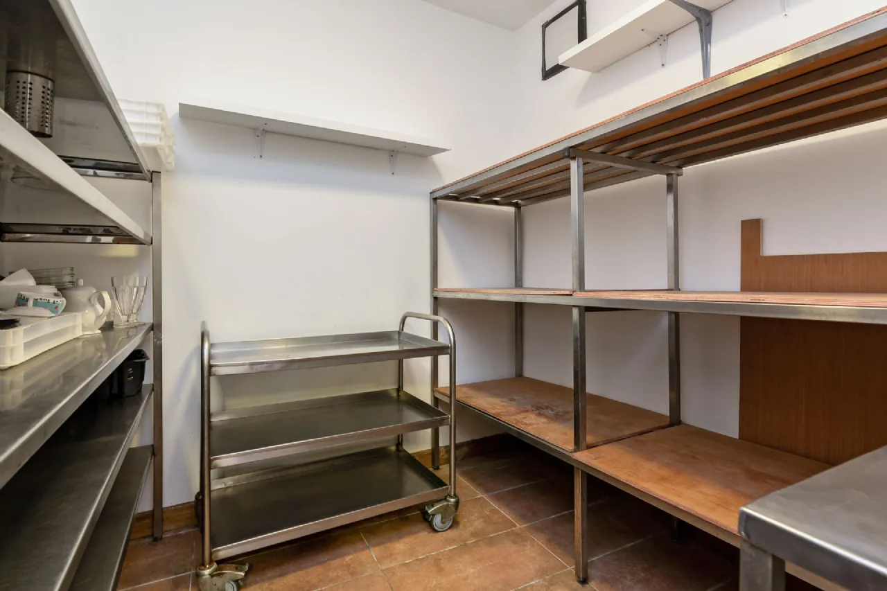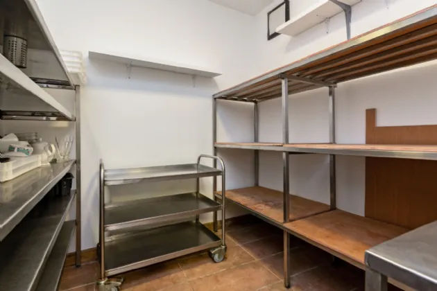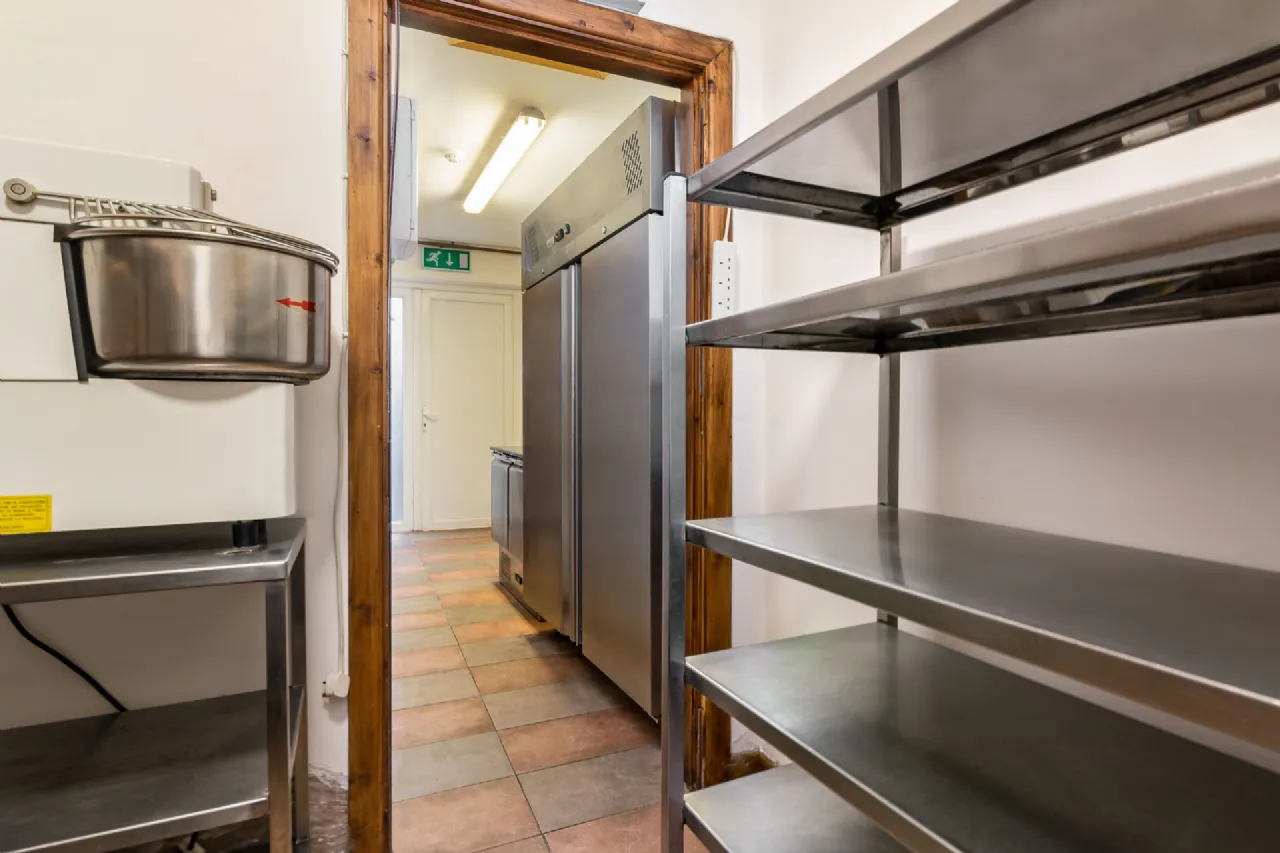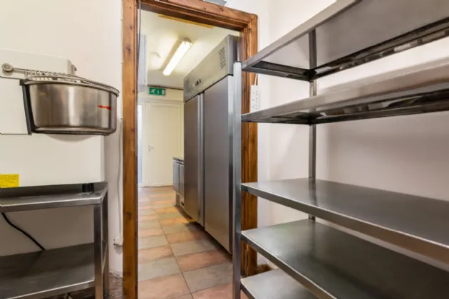 Rear KItchen and dry storage area 4m x 2.51m Large, double door refrigerated unit, stainless steel with granite worktop salad unit/dessert prep area. Fridge. Double racks in storage area, stainless steel table, Stainless Steel, 3 tier, commercial trolley