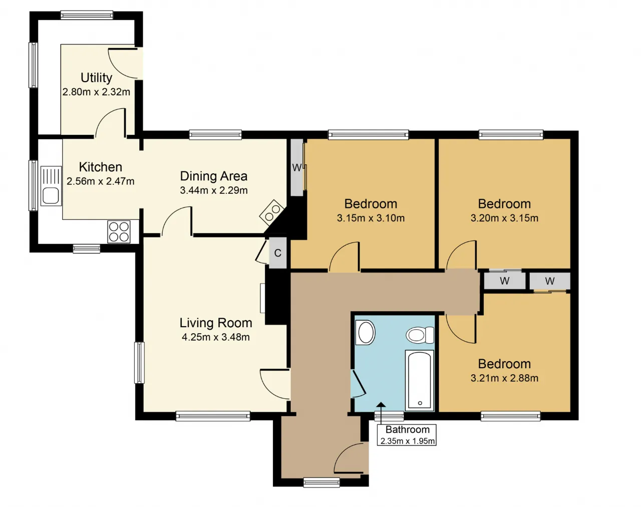 There are three bedrooms, all of which are double sized. The fully tiled bathroom has an electric shower over the bath.