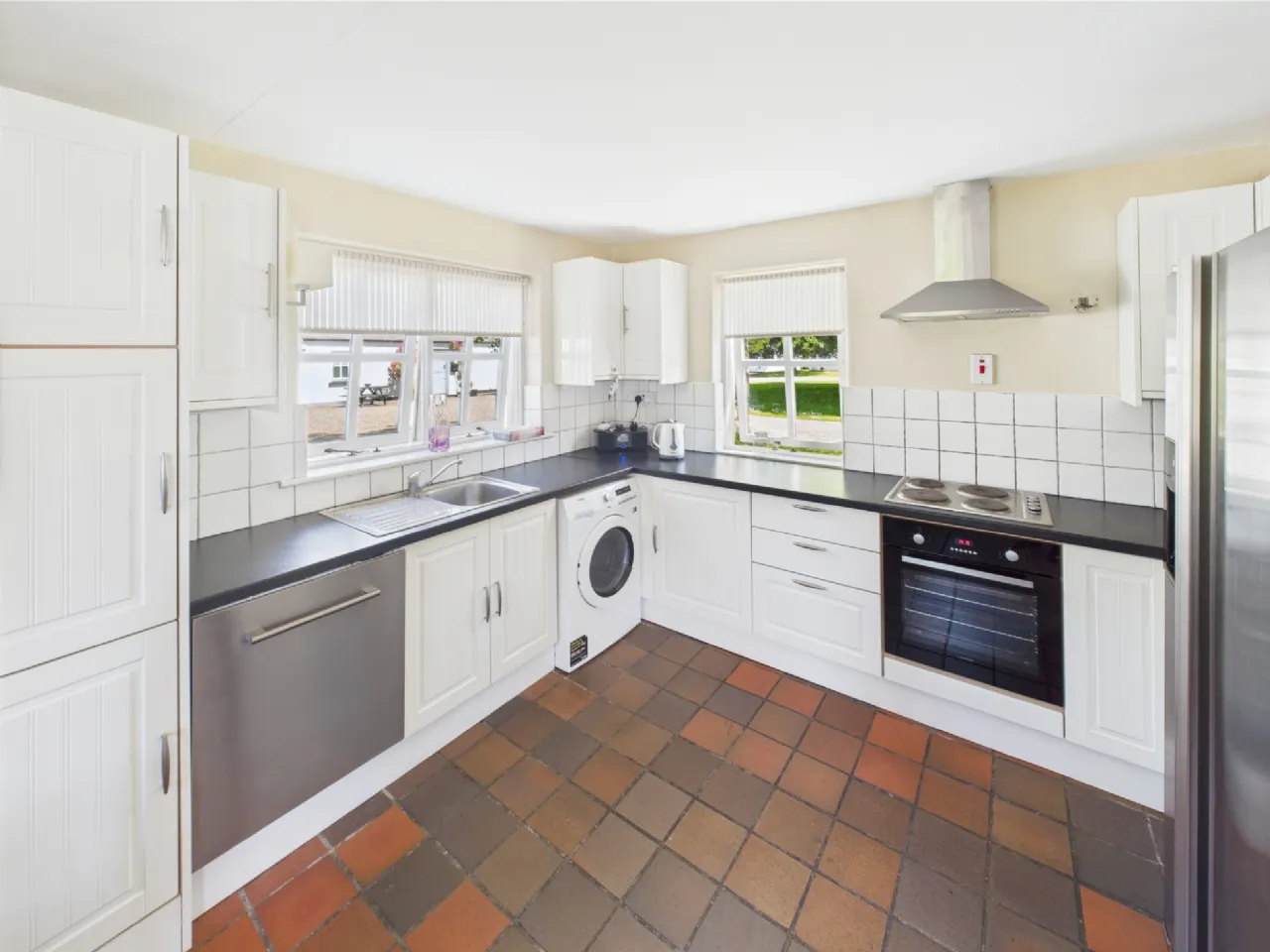 Kitchen 5.03m x 4.15m with fitted kitchen, electric hob, oven, extractor, tiled floor