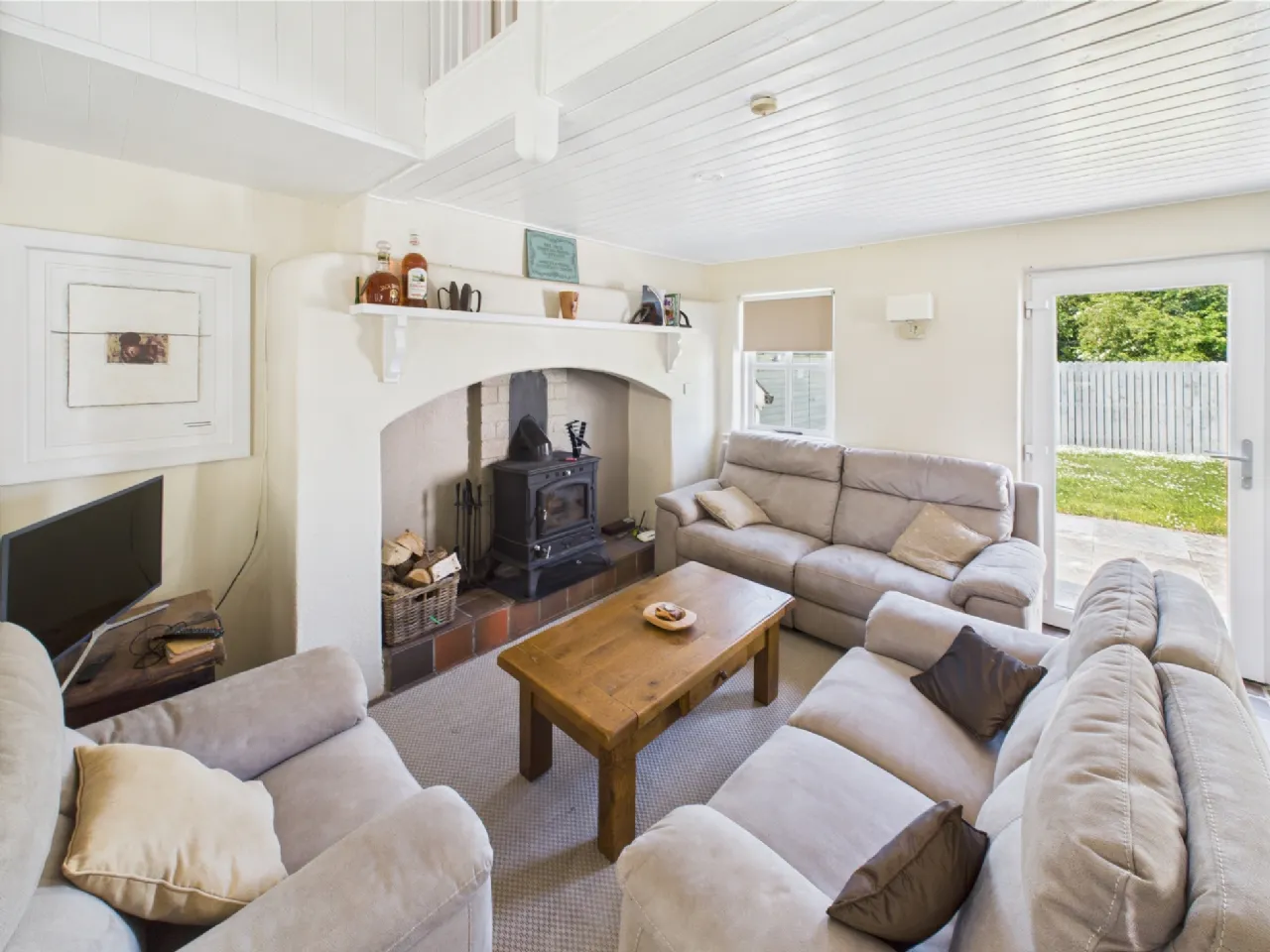 Living Room 5.03m x 3.47m with Inglenook fireplace with solid fuel stove, tiled floor & stairs to overhead accommodation