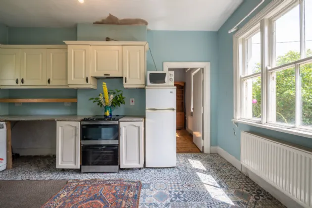 Kitchen/Dining 4.69m x 3.20m at widest point, linoleum flooring, tiled backsplash, fitted kitchen units, electric cooker, fridge freezer and plumbed for washing machine.