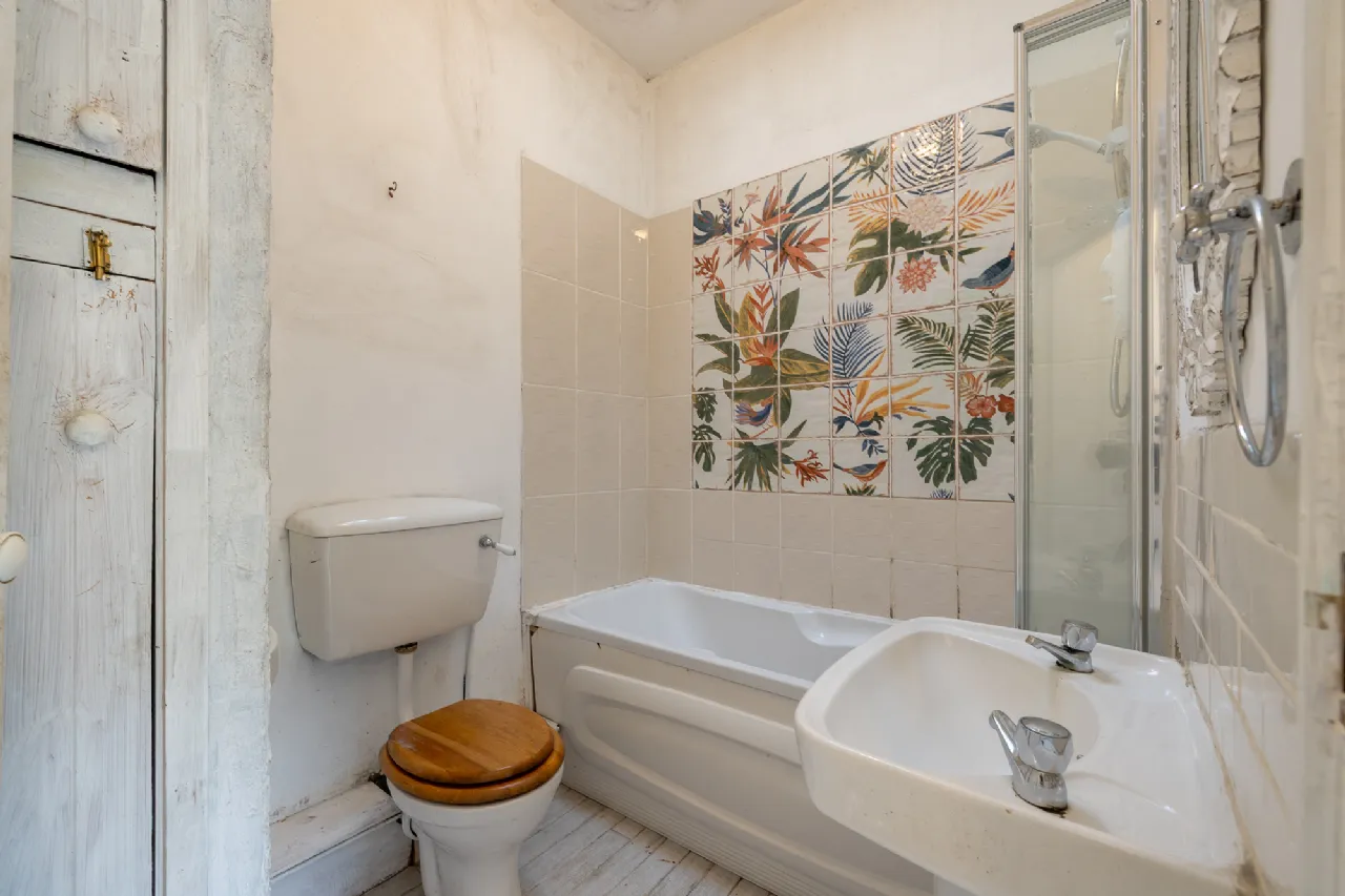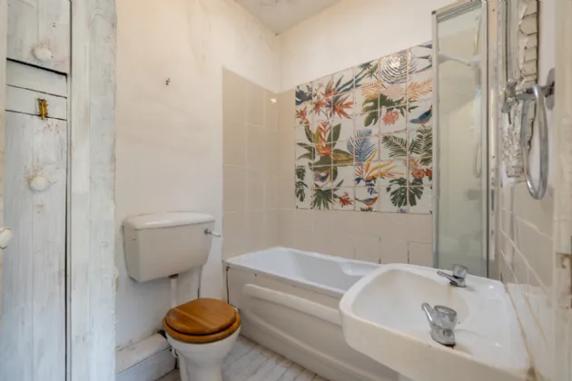 Bathroom 1.70m x 2.39m at widest point, tiled flooring and bath, bath, WC and wash hand basin.