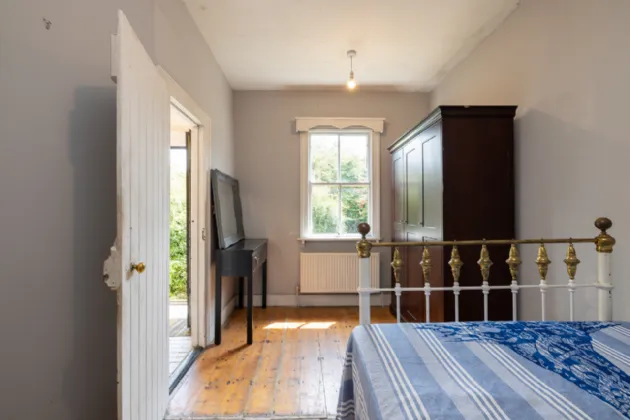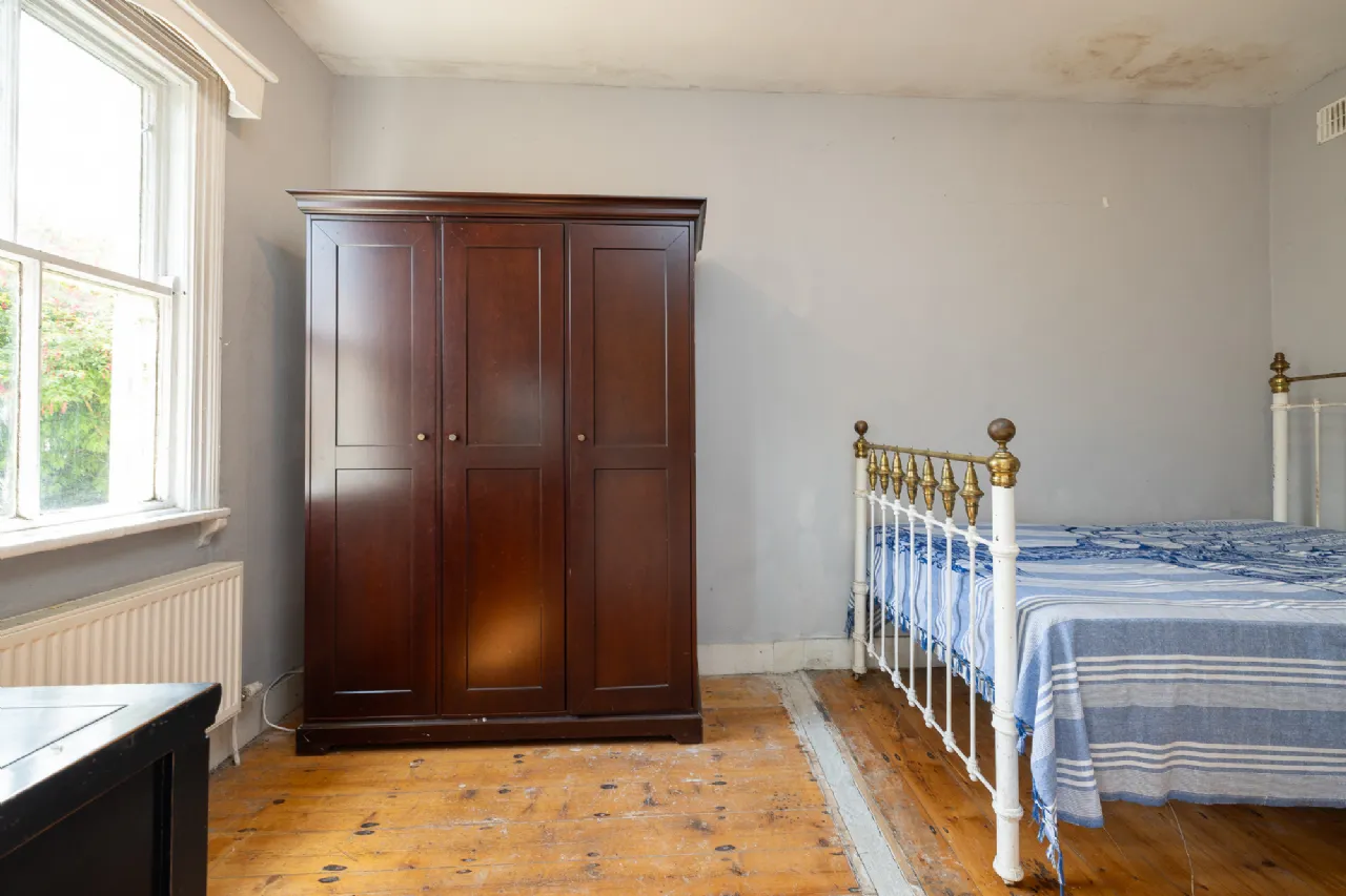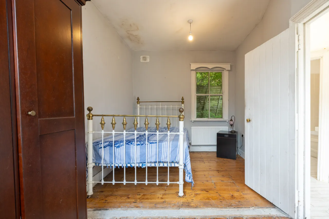Bedroom 1 4.69m x 2.16m at widest point, solid wood flooring.