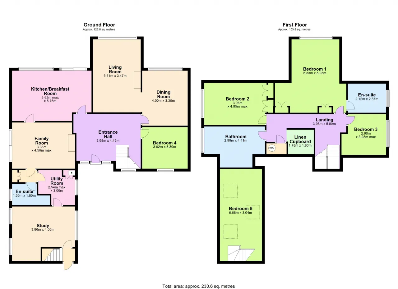 Upstairs the four further bedrooms are all doubles, there is a family bathroom and the master is en-suite. Overall, the c. 230.6sq.m (2,482sq.ft) of space offers a wealth of opportunity to meet your needs. A side-entrance downstairs also means that the suite of rooms to the left could lend themselves to au-pair accommodation or a semi-private space for guests or longer-stay relatives.