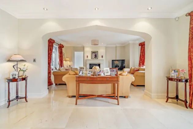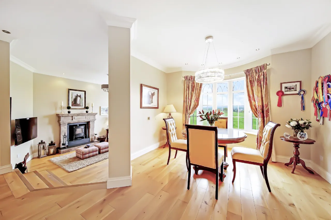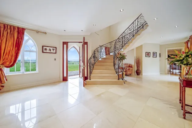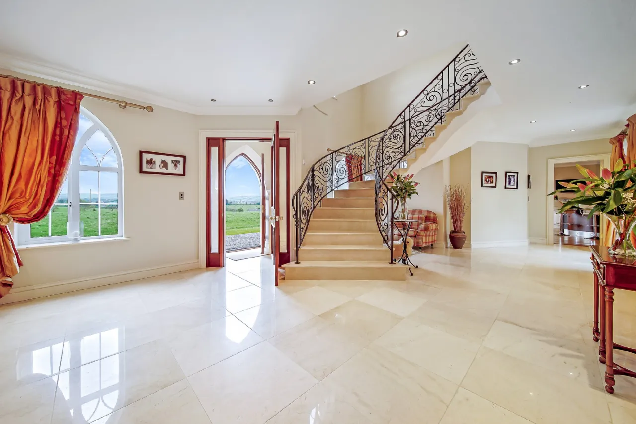 As you step inside the front door of Carrickbrack, you are immediately struck by its warm and inviting foyer. Featuring beautiful marble tiles and an impressive feature staircase, this space also serves as an open-plan living room, complete with a large open fire that fills the area with warmth.