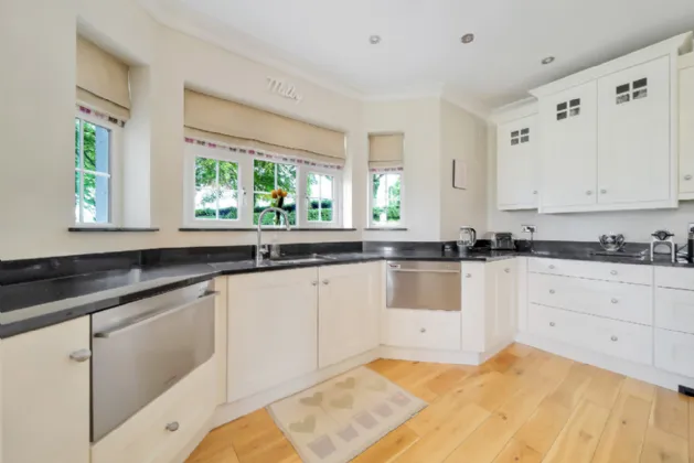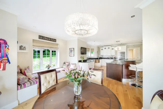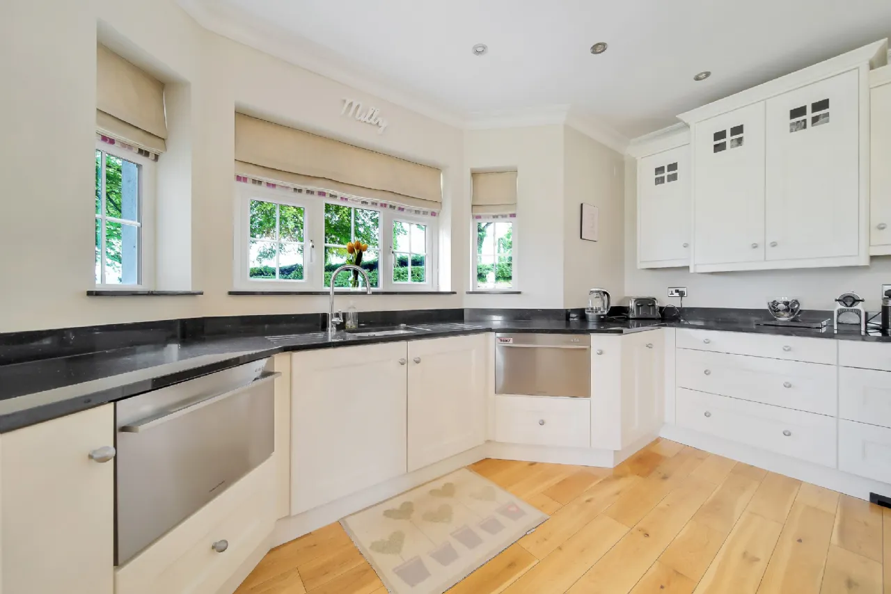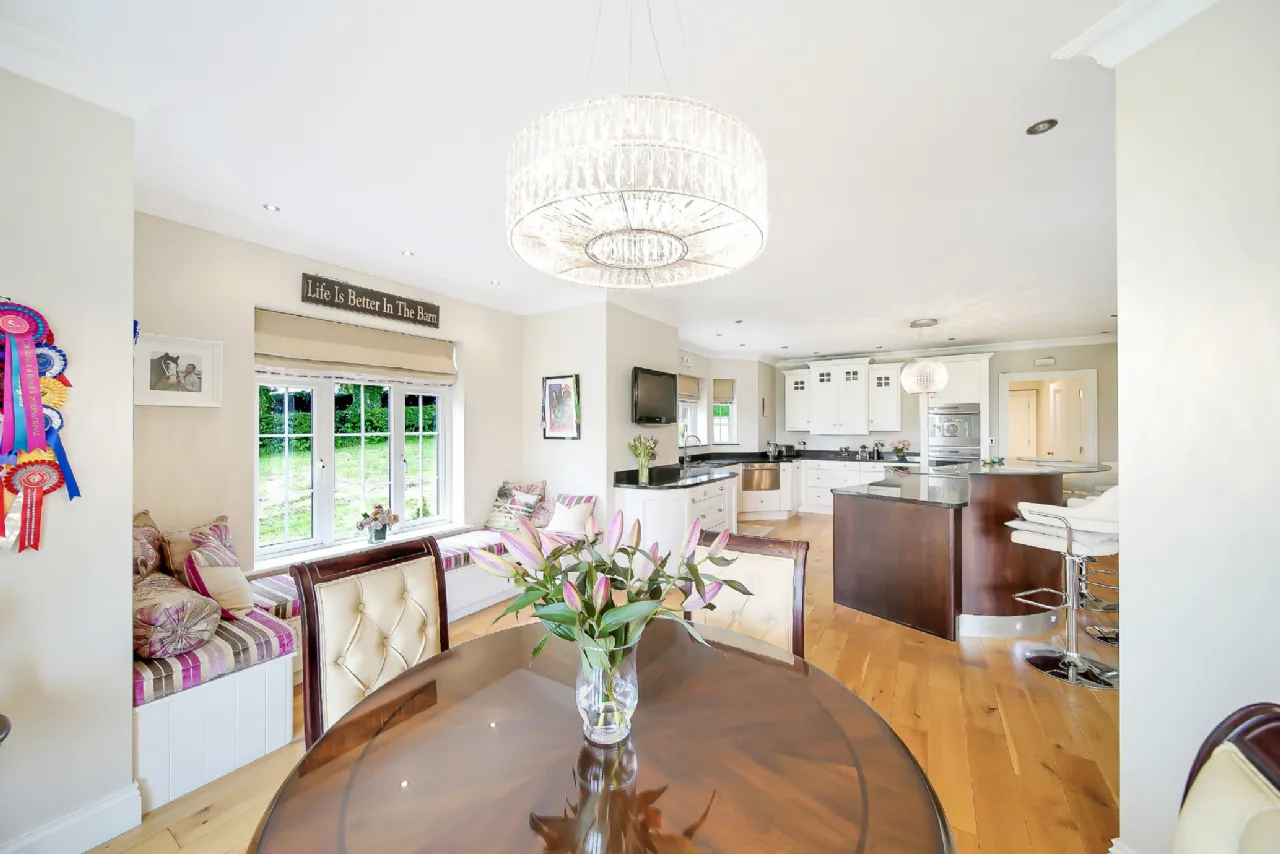Adjacent to this is the magnificent kitchen, the true heart of the home. It boasts exquisitely handcrafted kitchen units with granite countertops, a spacious island with a breakfast bar, and a stunning bespoke window seat that blends seamlessly into the space. While the dining area, perfectly positioned in front of a bay window, offers an ideal setting for meals with family and friends.