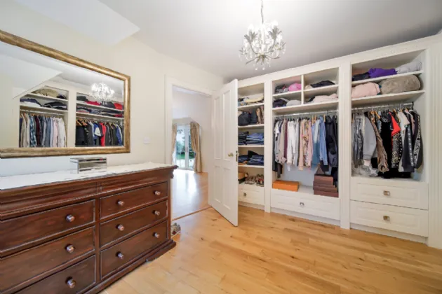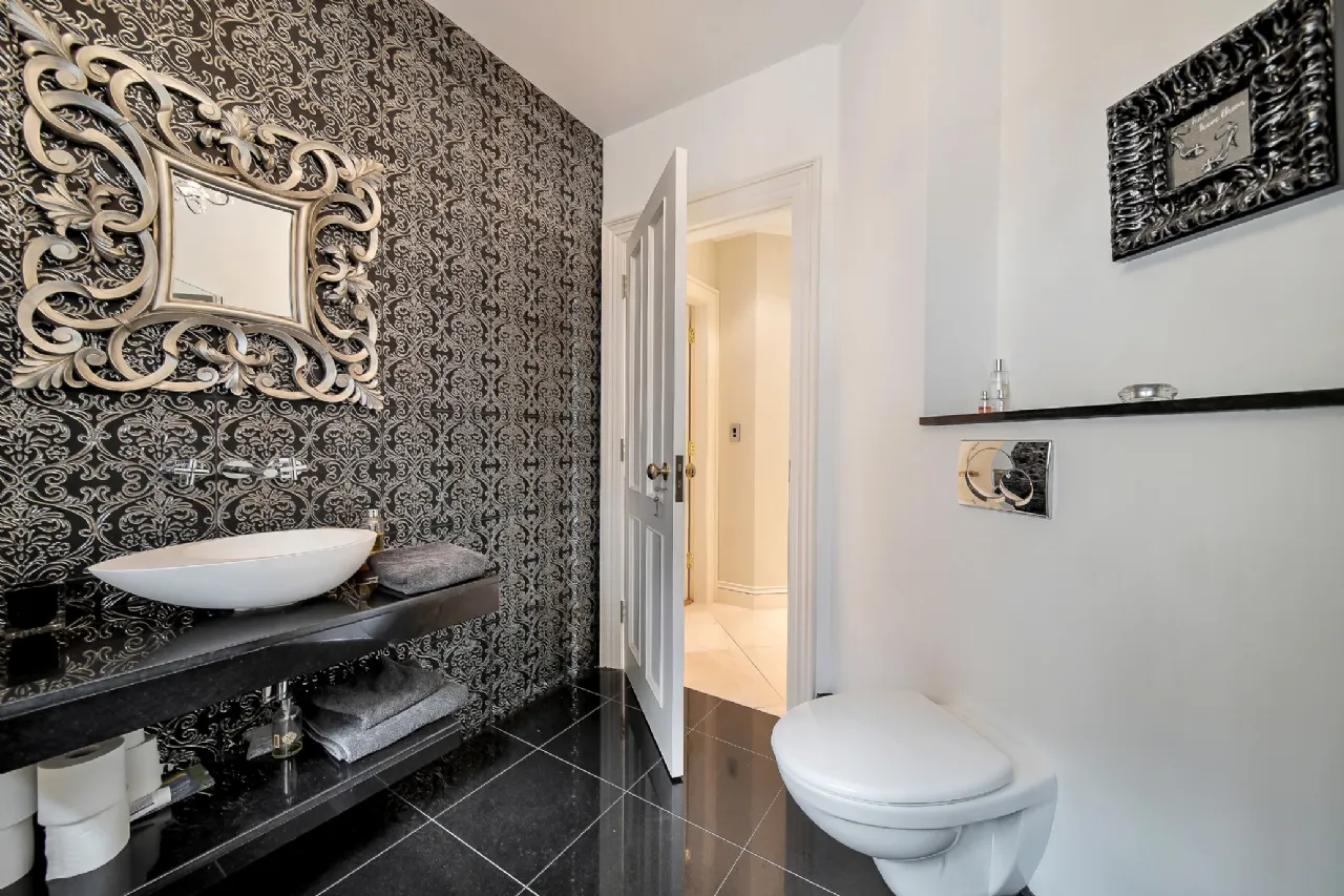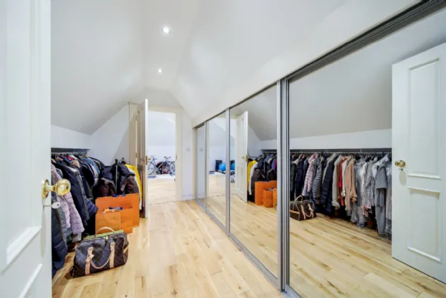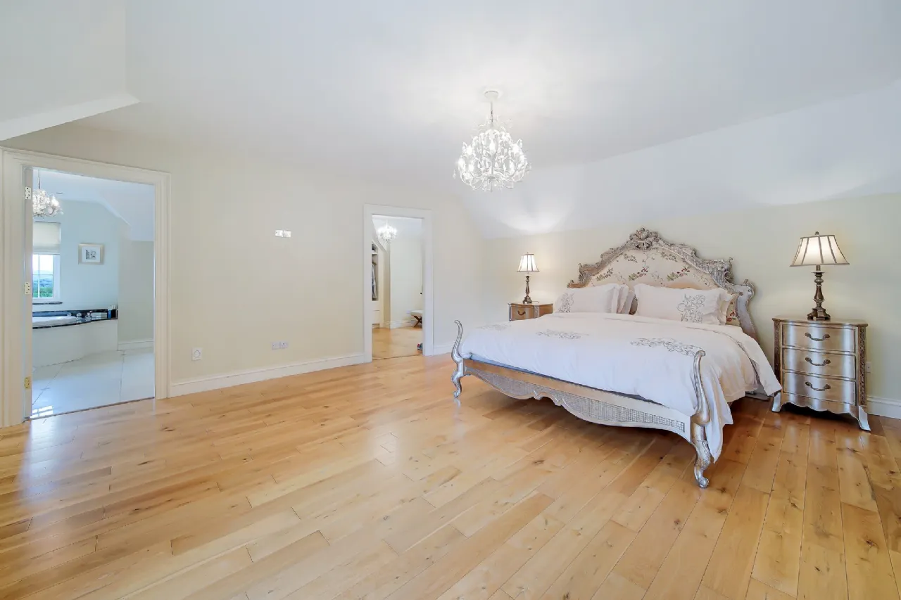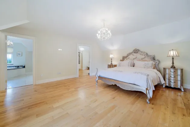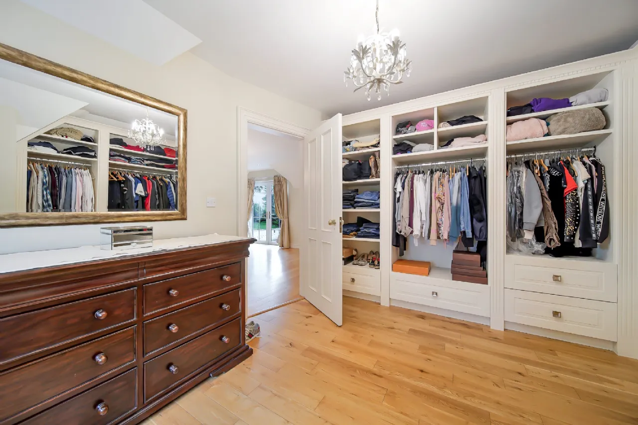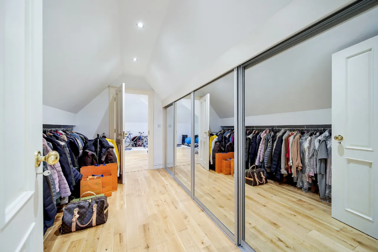 Upstairs, the master suite is truly impressive. On one side of the room, is a walk-in wardrobe featuring bespoke fitted shelves, drawers, and racks and an en-suite bathroom boasting a marble vanity unit with a double sink, a jacuzzi bath set into a marble surround, a toilet, and a large shower. On the opposite side of the room, another walk-in wardrobe leads to a spacious home gym, creating a private retreat away from the rest of the house.