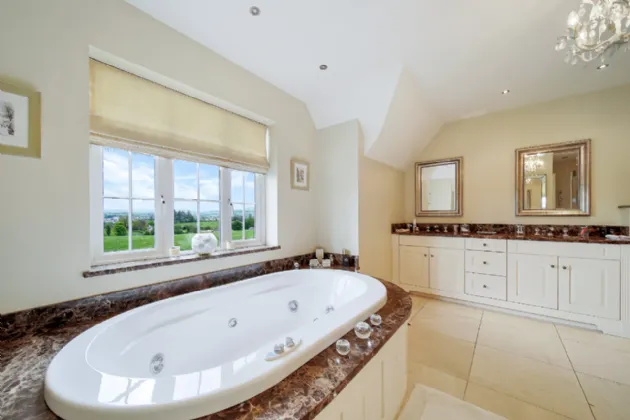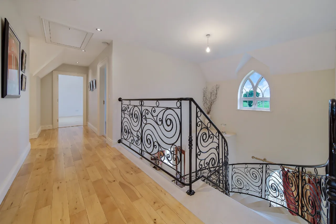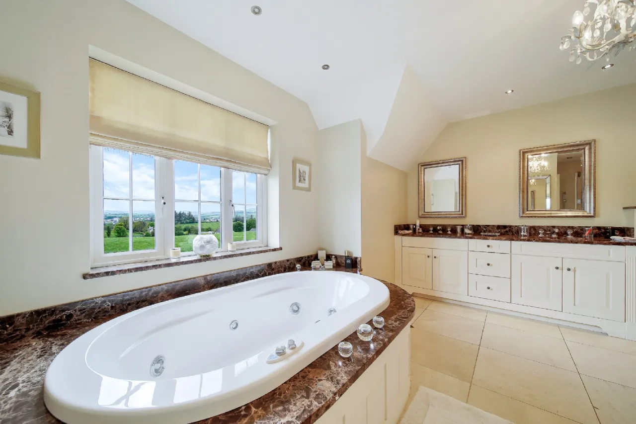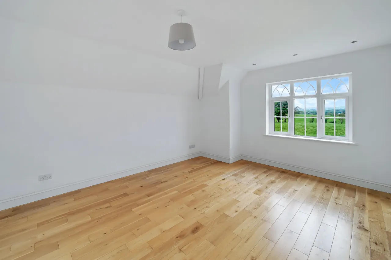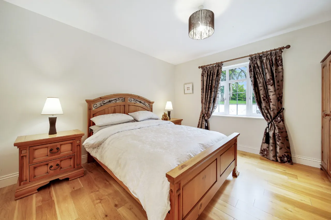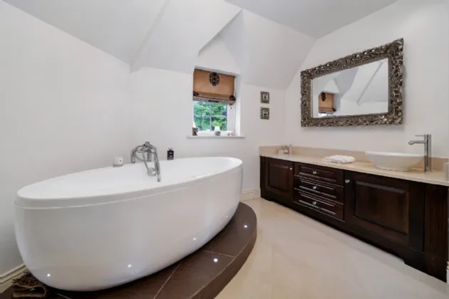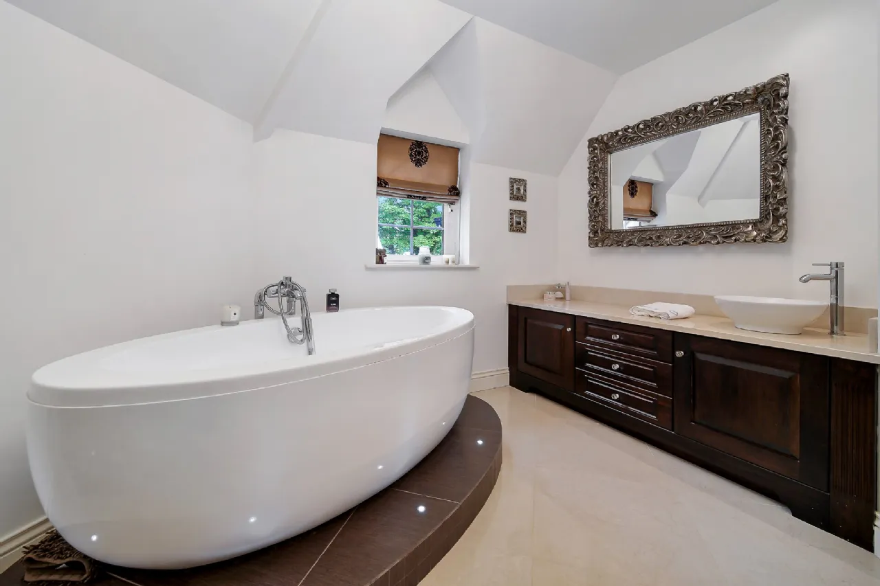 The upper floor is completed by three additional, generously sized double bedrooms and a beautifully designed bathroom, featuring a large wet-room shower, a mahogany vanity unit, and an elegant freestanding oval bathtub.
