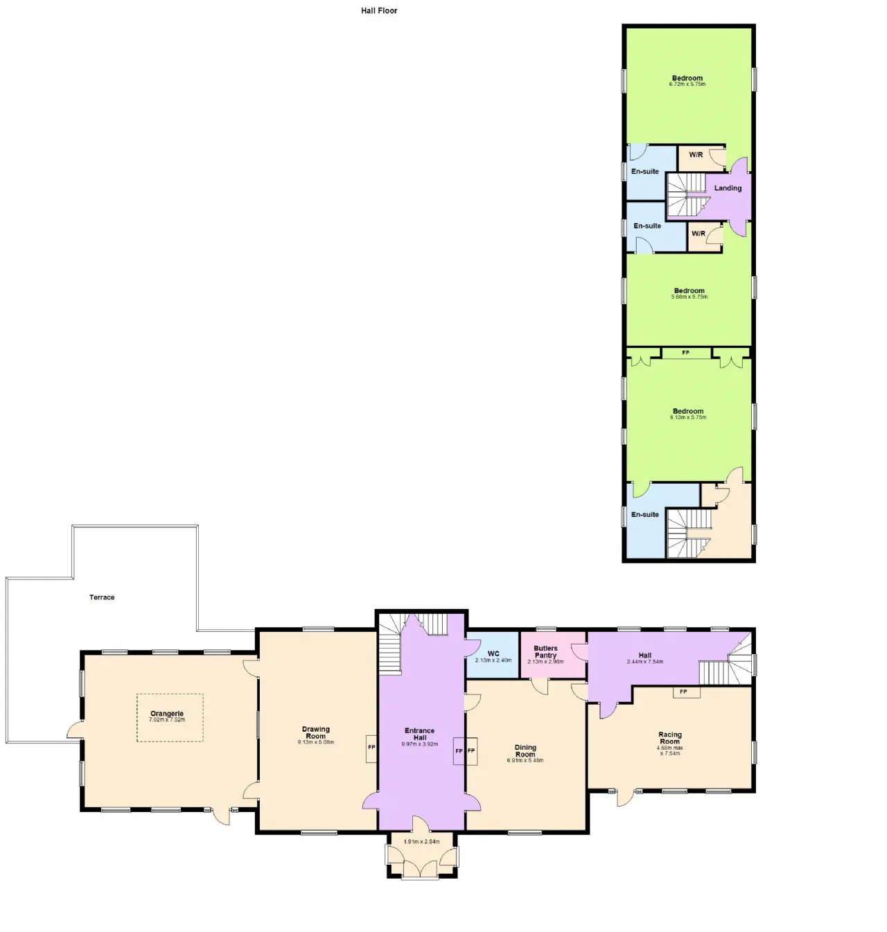 A staircase rises to a gallery landing at first-floor level, where two beautifully appointed bedroom suites overlook the front lawns. Both rooms are generously proportioned and immaculately presented, each featuring fireplaces and luxurious bathroom fittings. One suite includes an elegant dressing room with bespoke wardrobes, while the bathrooms are finished to an exceptional standard with high-quality fixtures and fittings throughout.