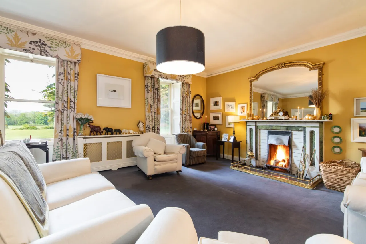 To the left, the drawing room offers a refined setting for entertaining, featuring a marble open fireplace that adds warmth and character. While two large sash windows, complete with original shutters, enhance the room’s grandeur.