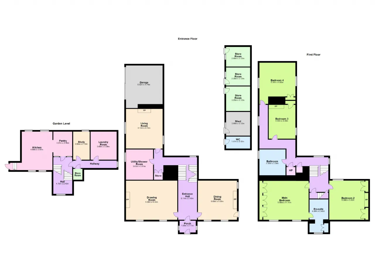 Tucked into one corner of the walled garden, a charming courtyard houses four small sheds, perfect for storing firewood and other outdoor essentials. The walled garden is directly accessible from the kitchen, where a raised patio provides the perfect spot for summer barbecues and outdoor relaxation. The outdoor amenities are further enhanced by a spacious double garage, located on the opposite side of the rear of the house, providing ample storage and secure parking.