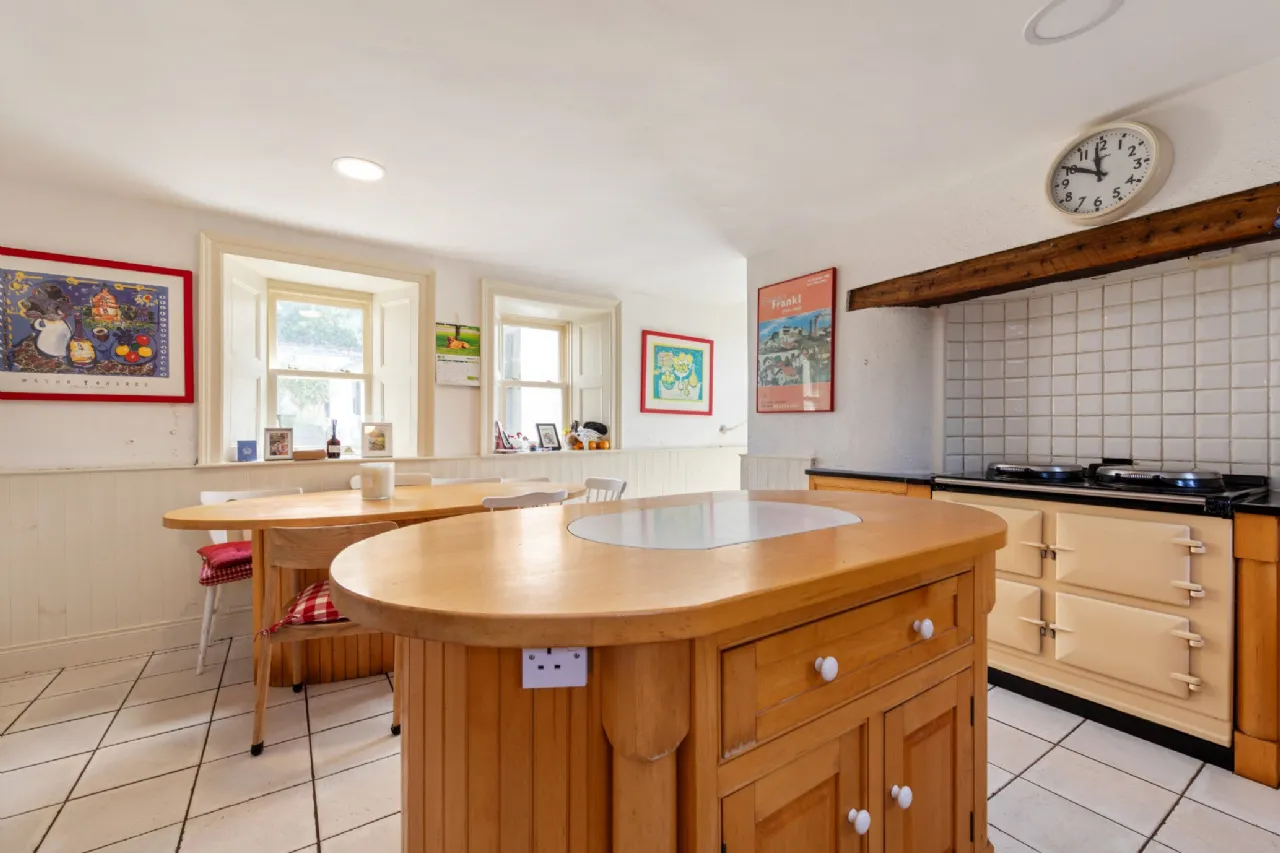 The stairs continue down to the basement, where you will find the kitchen. This traditional space features wooden cabinets, an island unit, a double Belfast sink, a gas hob, and a classic Aga. A door from the kitchen leads out to a walled garden at the side of the house. The basement also includes a couple of small rooms, ideal for storage or various other uses.