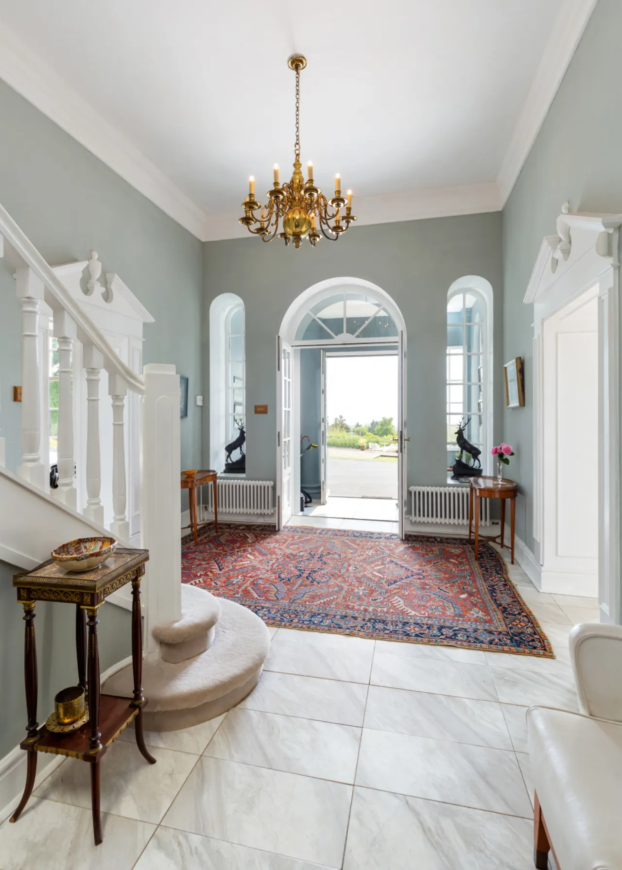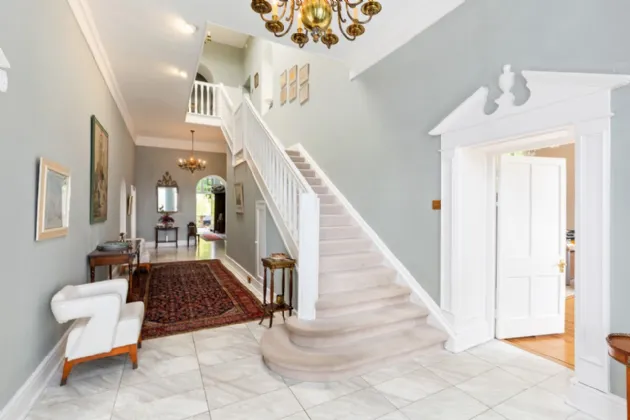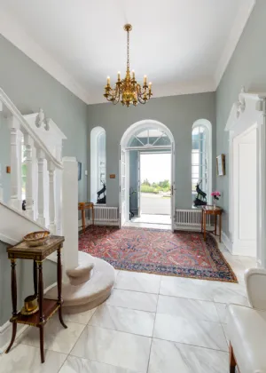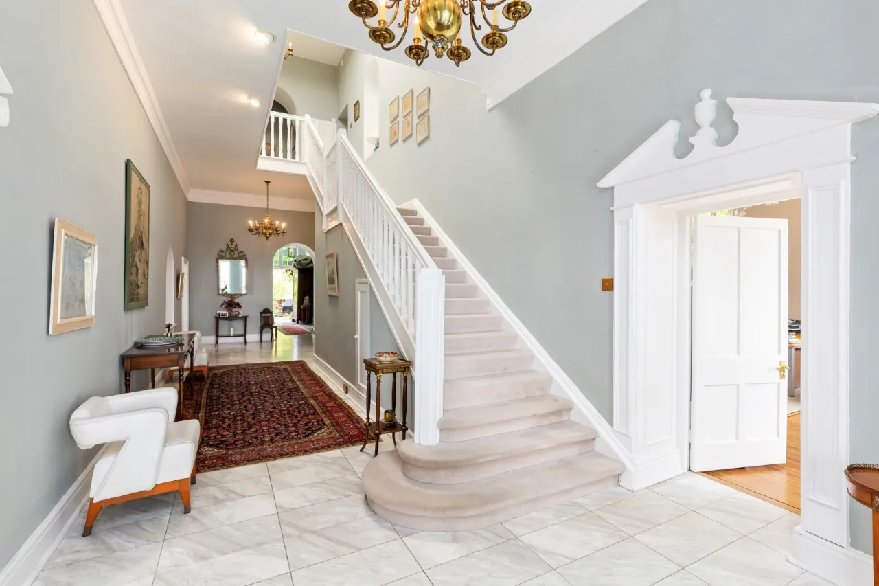 As you step inside the main residence, one is presented with a world of refined luxury and timeless elegance. The journey begins as you pass through the double glass front doors, guided by a flight of granite steps, into a welcoming porch. Beyond lies the impressive entrance hall, a central hub connecting all the rooms on this floor.