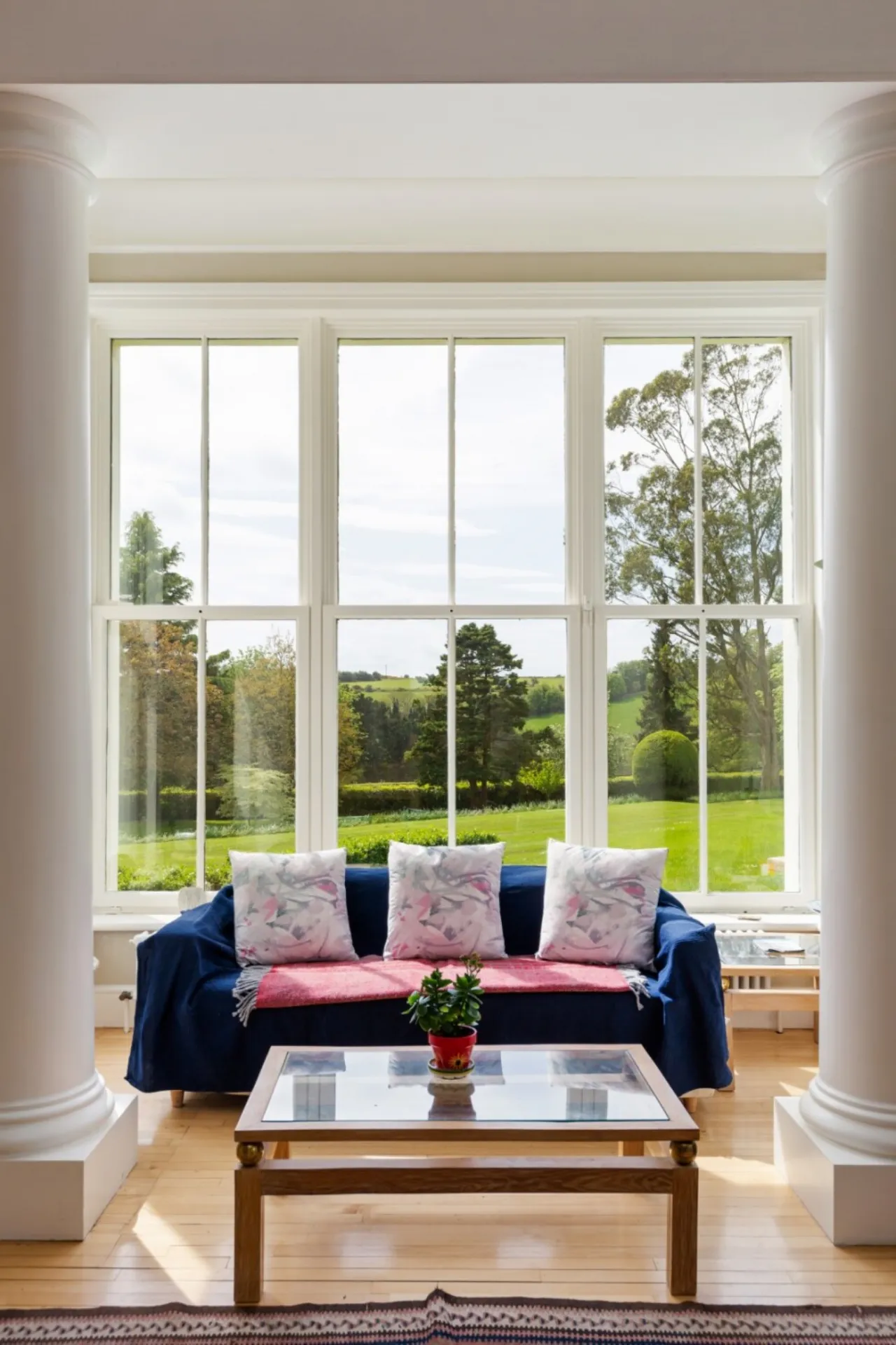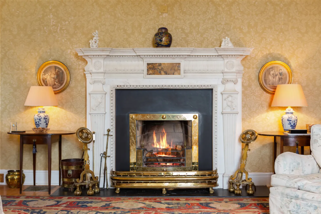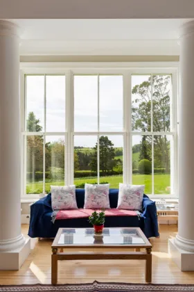 To the left, the great ballroom awaits, bathed in natural light streaming through picture windows and a bow window that overlooks the sprawling grounds. Combined with intricate details including ceiling roses, maple sprung floors, and a marble fireplace, the ballroom sets the stage for formal gatherings.