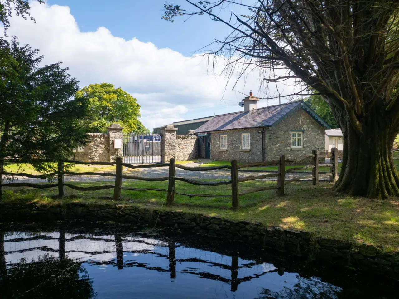 In addition to the accommodation in the main house are two charming gate lodges. The main gate lodge is newly renovated and comprises two bedrooms, a living room, kitchen/dining room, bathroom, and an outside terrace with underfloor heating and a sewage treatment system. The second gate lodge, named Goose Cuckoo Gate Lodge, has been restored, extended, and renovated to a very high standard. It comprises a master bedroom, kitchen, living room, and opens up onto an outside terrace. Situated next to the lake on the southeast side of the estate, each gate lodge has its own private off-street parking.