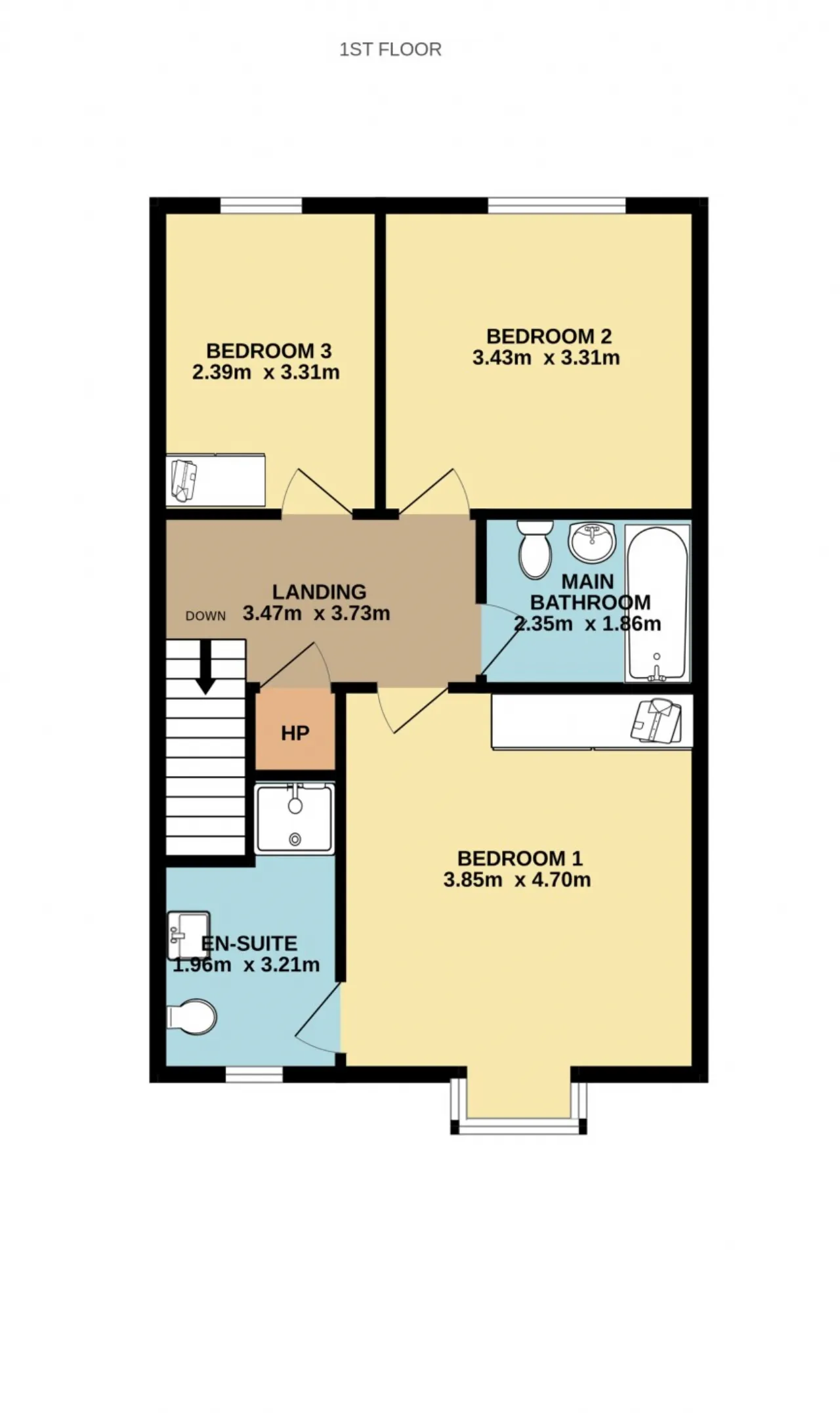 Bedroom 1 4.70m 3.85m Spacious double bedroom that features solid timber flooring and a bay window overlooking the front of the property. Fitted wardrobe allows for additional storage and there is access into the en-suite.