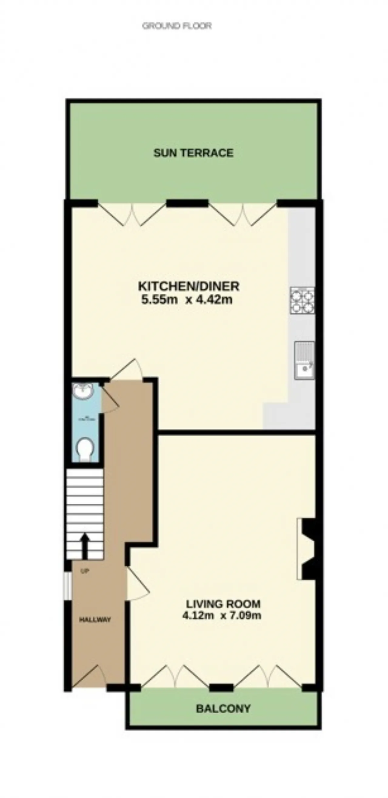 To the rear there is a separate open-plan kitchen/dining room that offers excellent space for both cooking and entertaining. This space opens out onto a private, balcony perfect for enjoying sunny days and quiet evenings, with the added benefit of not being overlooked.