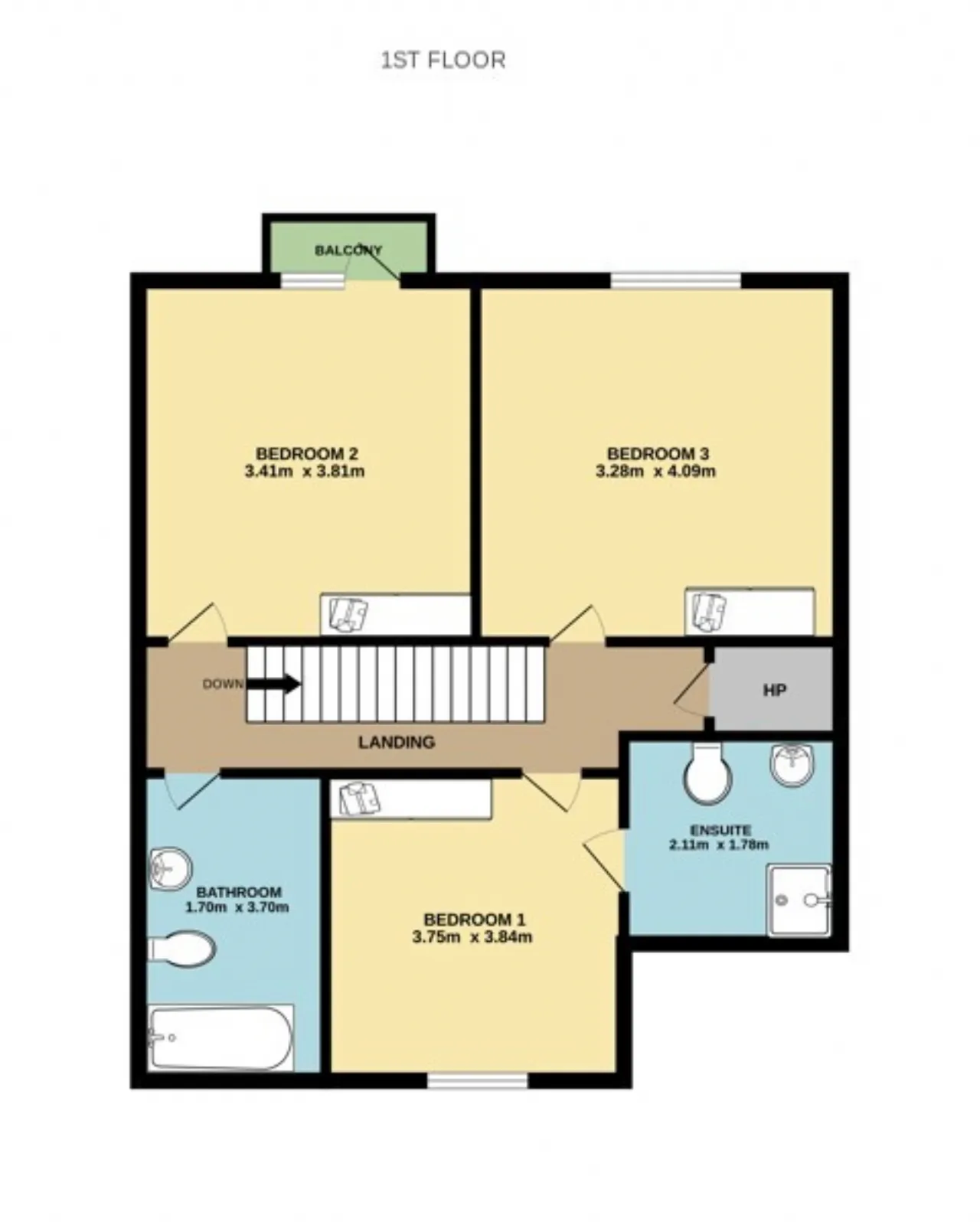 Bedroom 3 3.44 x 3.86 Generous third double bedroom with carpet and fitted wardrobe. Enjoys access to private balcony overlooking communal gardens to rear.