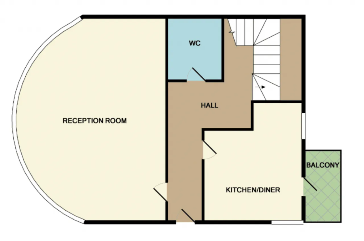 Lounge 5.2m x 4.3m Feature fireplace with large built-in units, double glazed window to side access, large, curved wall with double glazed windows and a double-glazed door leading to a Juliette balcony. Wide plank wooden flooring.