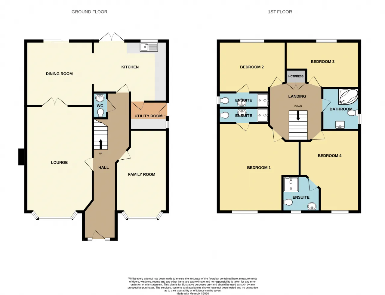 Constructed in 2004, block built and with all mains services, the interior extends to 175m² over two floors and presents a 4-bed-4-bath first floor configuration.