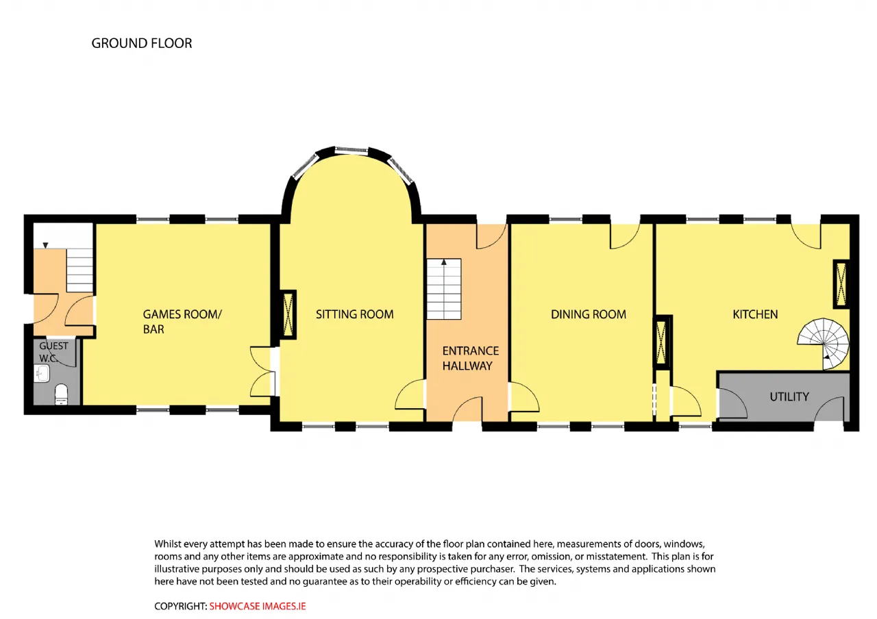 Games Room 5.56m x 7.29m Double doors off Reception 1. Solid Oak timber floor. Twin windows to front and rear, blinds. Corner bow detail with wall mirrors. Coving. Rear hall off.