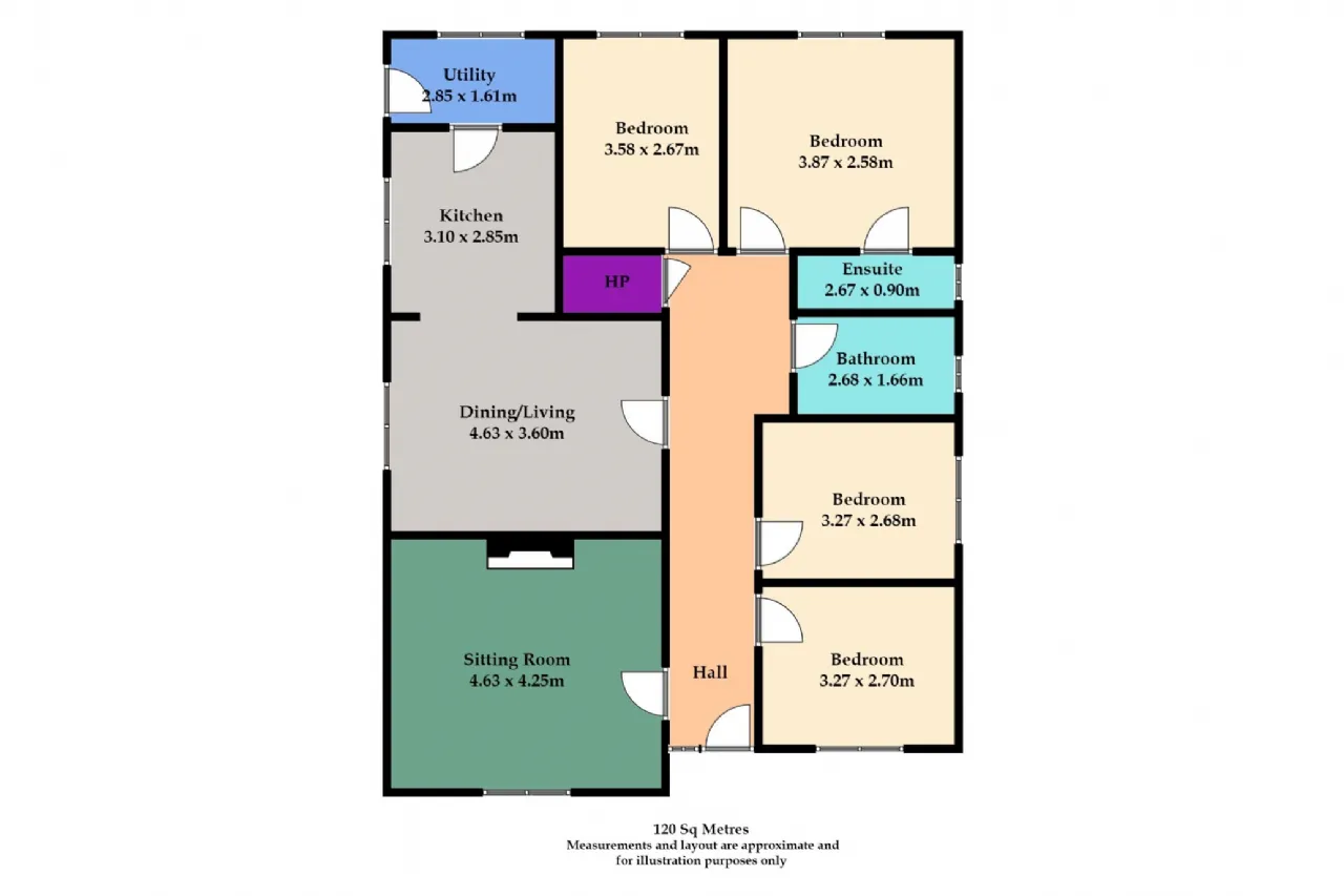 The accommodation offers a balanced arrangement extending to a comfortable 120 sq. m. approx. comprising; entrance hallway, sitting room, kitchen / dining / living room, utility, 4 bedrooms an en-suite and bathroom.