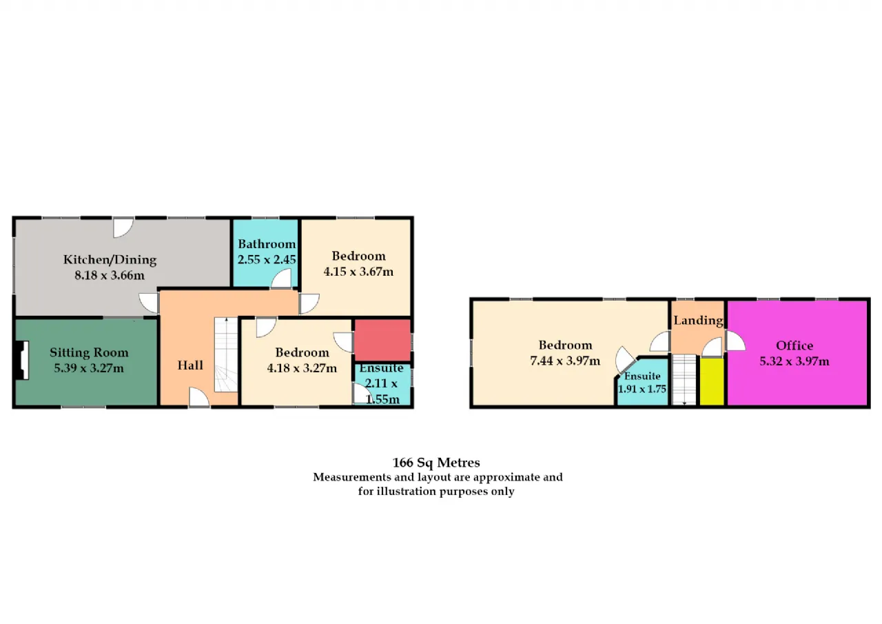 The accommodation extends to 166 sq. m approx. with modern kitchen/dining room, sitting room, bathroom, 3 spacious bedrooms (2 en-suite) and an office / playroom.