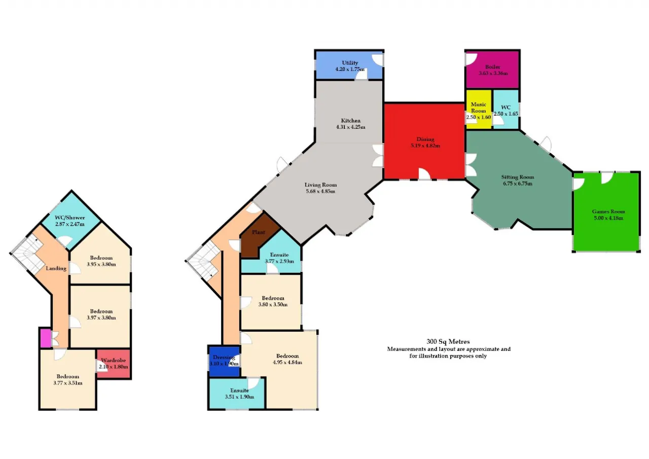 Set on approximately 1 acre of mature, south / southwest facing gardens, the property offers privacy, natural light and spectacular views. Accessed via electric gates and a winding tarmacadam driveway, the house sits on a gently sloping site that harmonises with its peaceful and scenic setting. The beautifully landscaped gardens are surrounded by a variety of mature trees and bedding. A substantial paved patio wraps around the rear of the property with openings from the dining, sitting and games room, perfect for al fresco dining and entertaining.