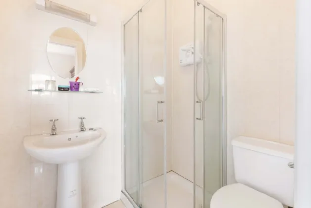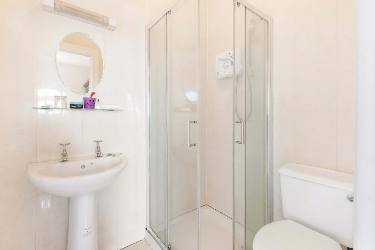 Ensuite 1.80m x 1.44m Ceramic tiled flooring, pvc panelling to walls, electric shower, w.c., wash hand basin.