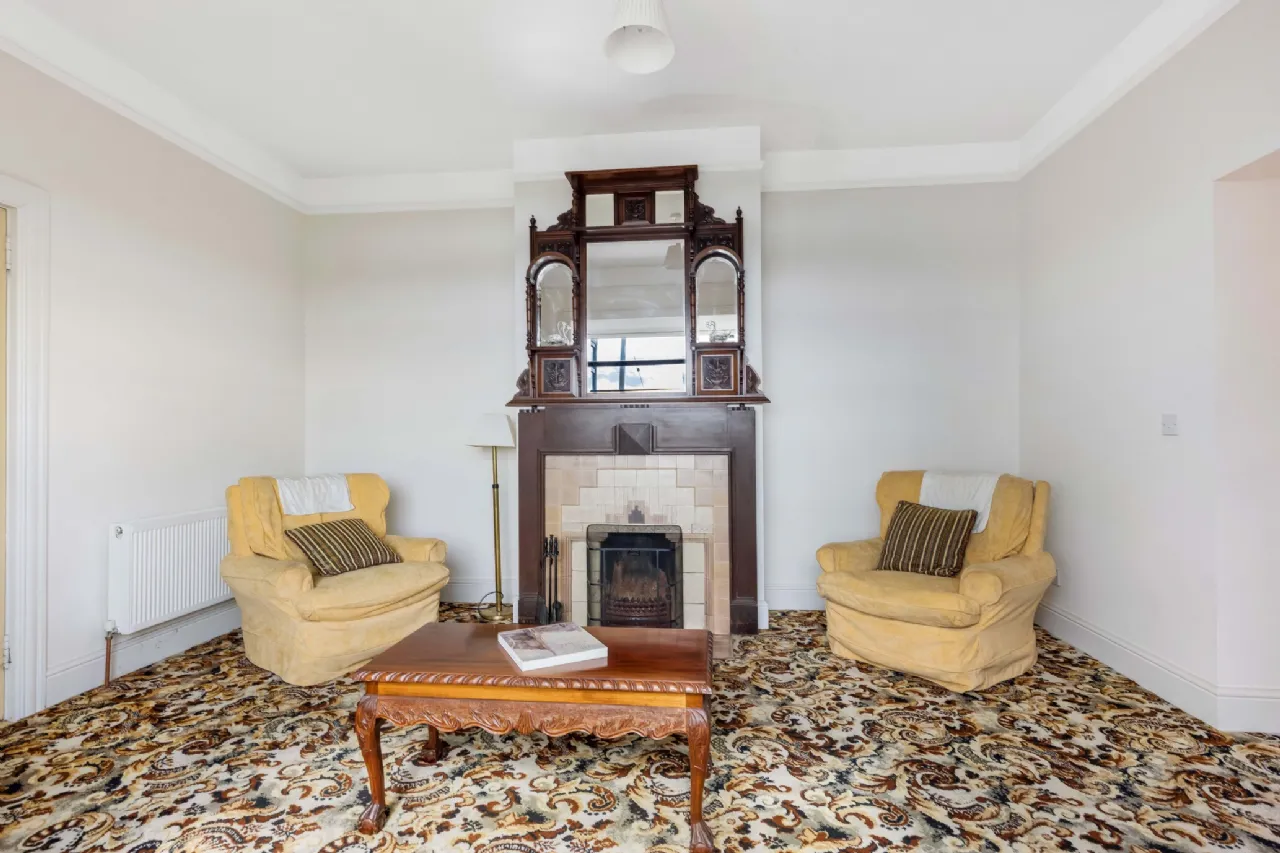 Sitting Room 4.62m x 3.50m (bay window, 2.03m x 1.12m) Carpeted flooring, open hearth fireplace with mahogany surround.