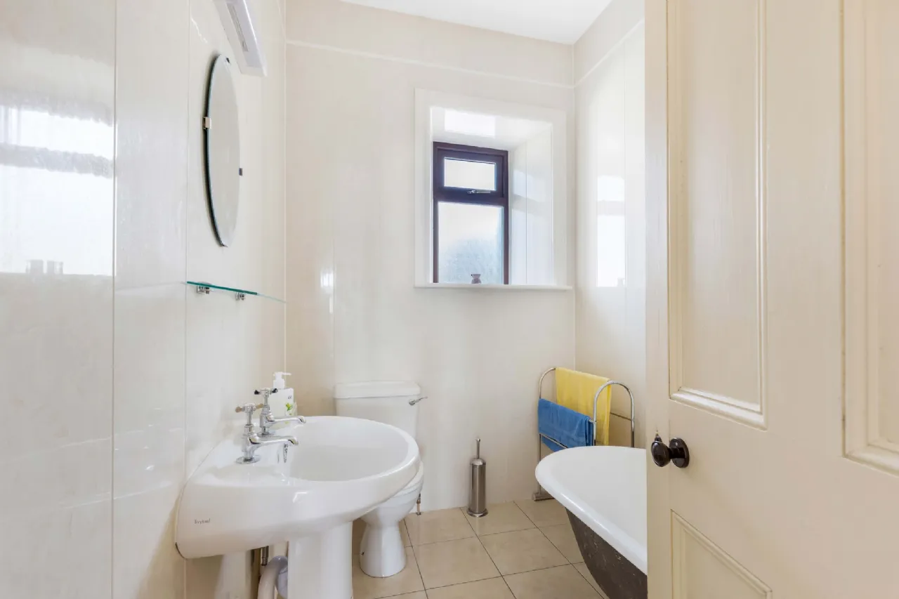 Bathroom 2.38m x 1.73m Ceramic tiled floor, pvc lining to walls, roll top bath, w.c., wash hand basin.