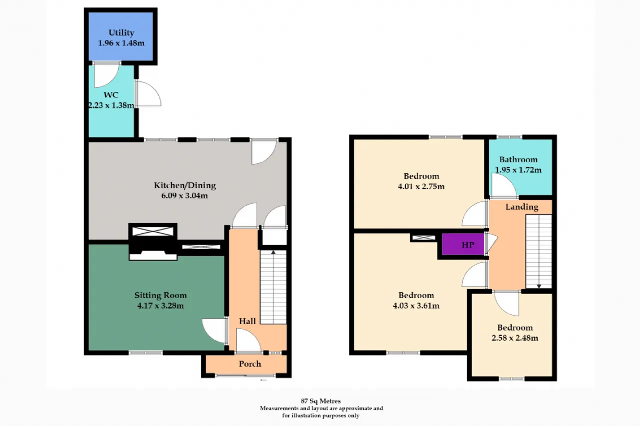 A comfortable home extending to 87 sq. m approx. the accommodation includes, entrance hall, sitting room, kitchen / dining room, guest w.c. and utility. On the first floor, 3 bedrooms and a family bathroom.