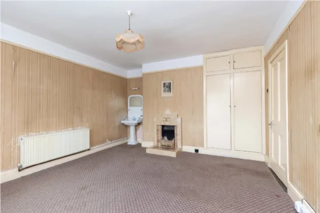 Bedroom 2 4.66m x 4.05m Vinyl flooring, vanity basin, built in wardrobes, open hearth fireplace with tile surround.
