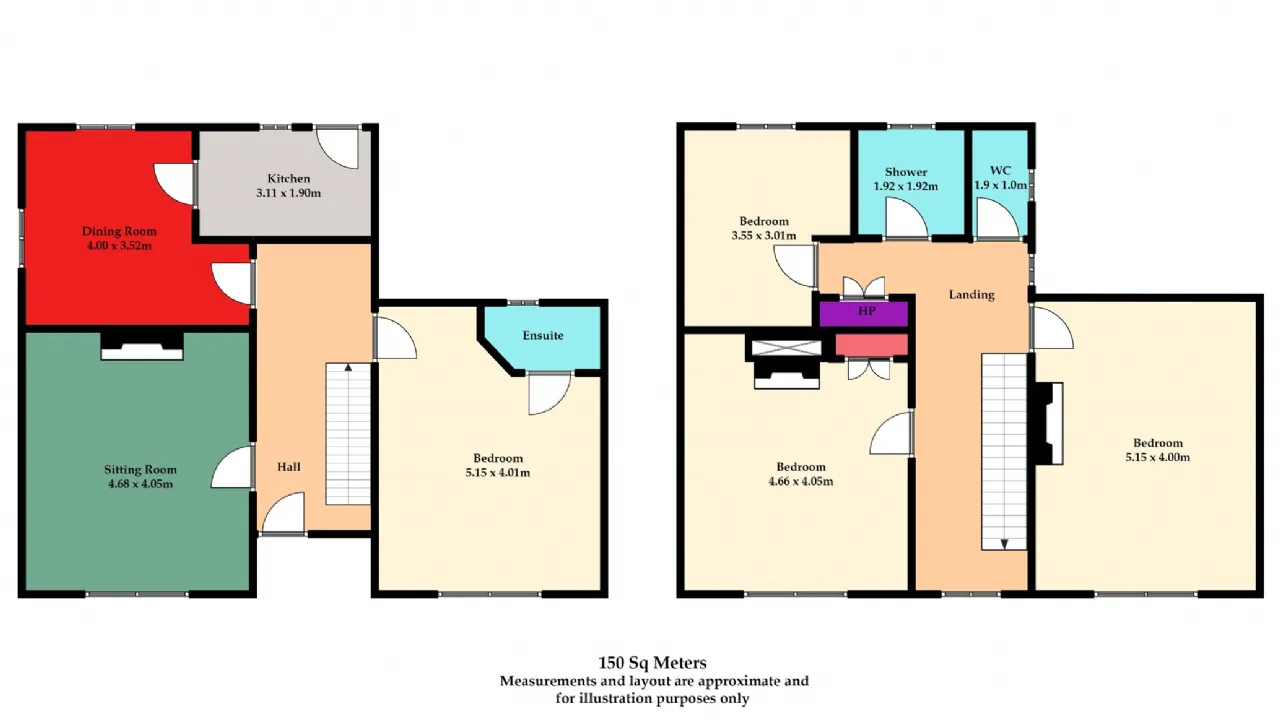 En-Suite 1.35m x 2.58m Vinyl flooring, part tiled walls, w.c, wash hand basin, shower.