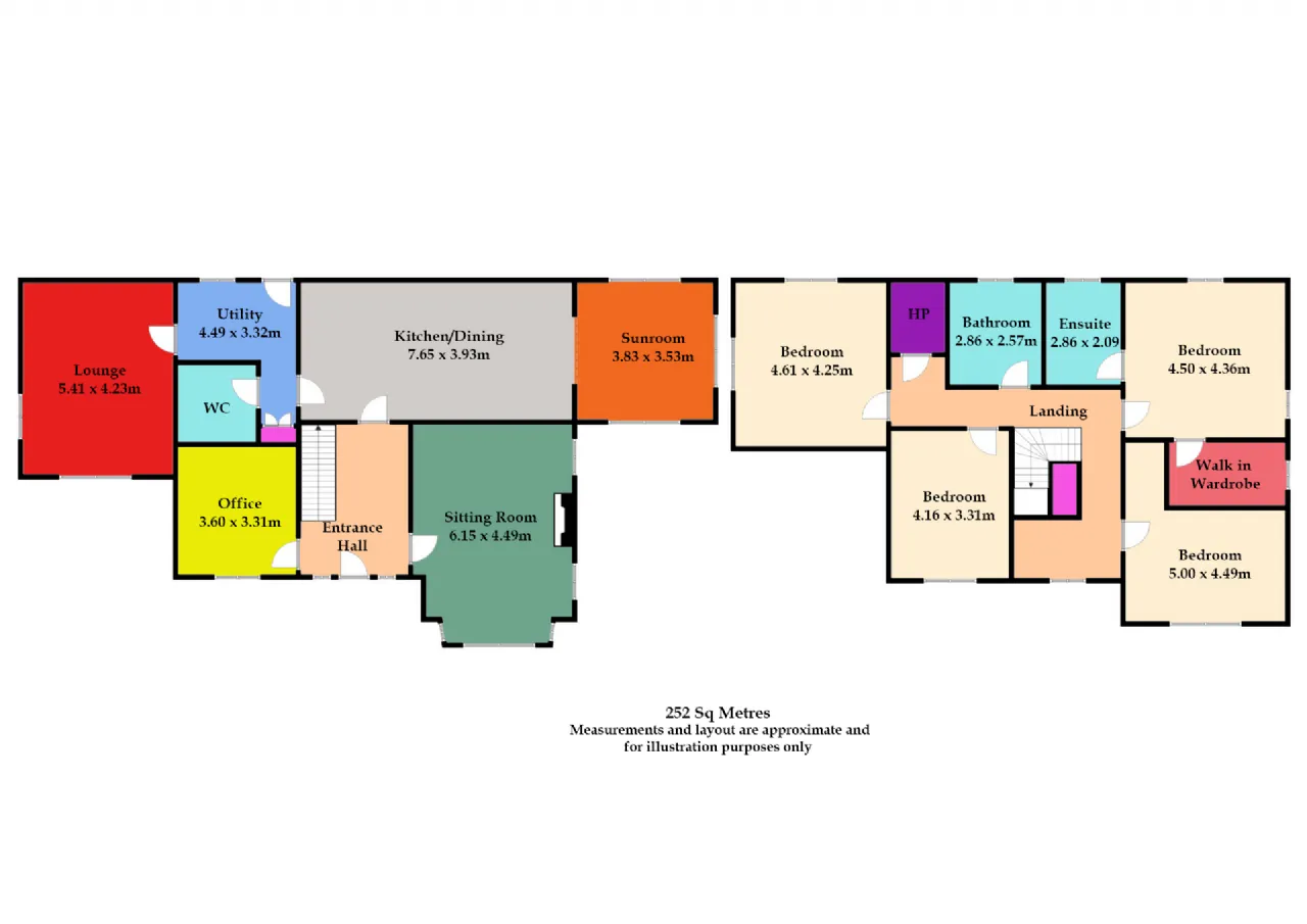 Generously proportioned accommodation extending to approximately 252 sq.m. The ground floor comprises a welcoming entrance hall, a spacious living room, a separate office, lounge, and a bright sunroom that benefits from triple-aspect windows, flooding the space with natural light. The stylish kitchen/dining area features an in frame solid painted kitchen with natural stone countertops and French doors opening onto the rear perfect for indoor-outdoor living. A well-equipped utility room and a guest w.c. complete the ground floor. Upstairs, there are four well-appointed bedrooms, including a luxurious master with an ensuite and walk-in wardrobe. A modern family bathroom serves the remaining bedrooms, offering both functionality and comfort.