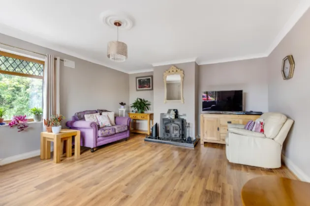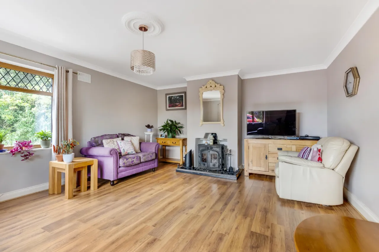 Sitting Room 5.74m x 4.75m Laminate flooring, solid fuel stove, coving, centrepiece.