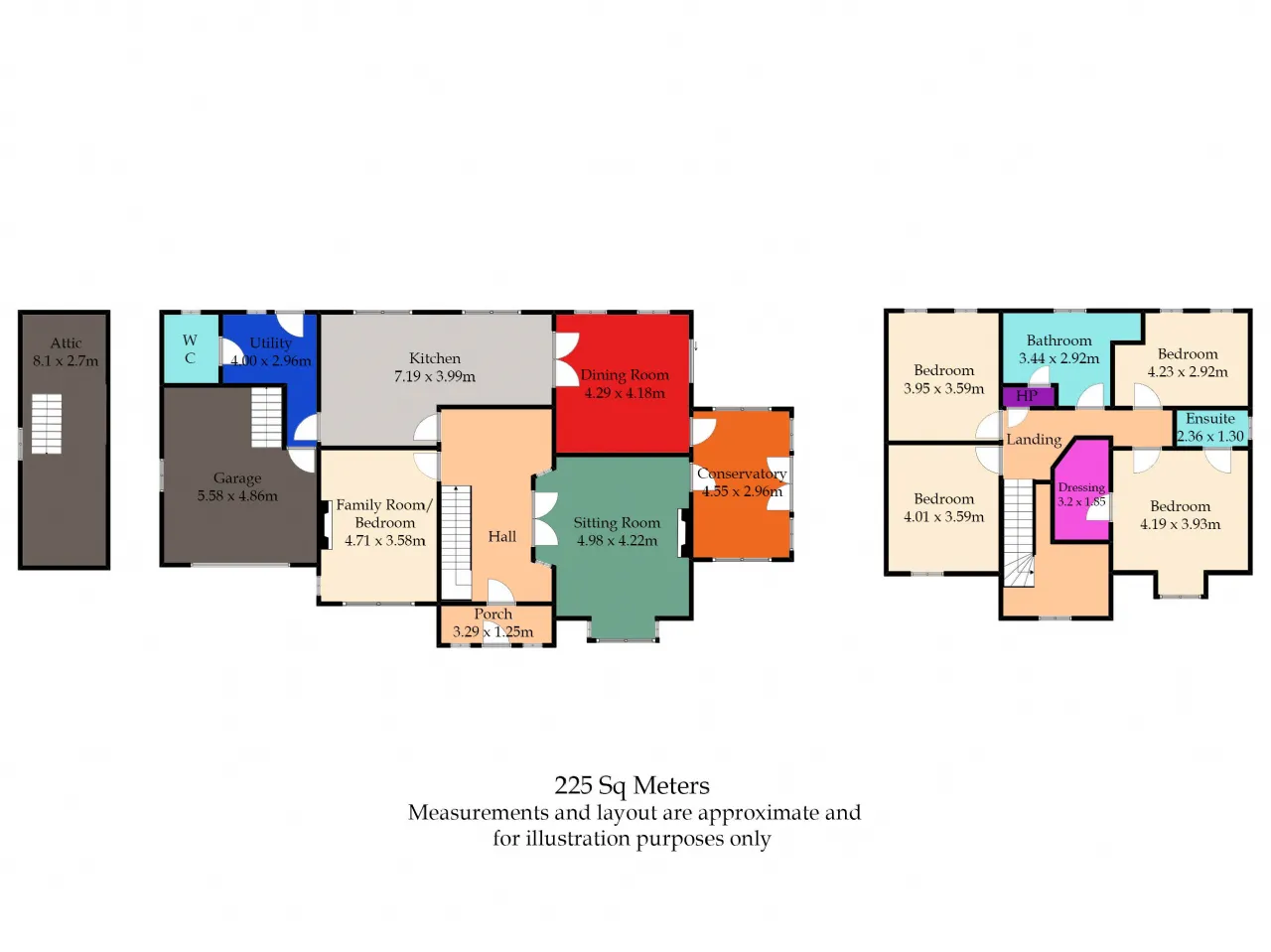 An imperial entrance hall sets the tone for the property with a solid timber staircase and a casement set of double doors leading to the main sitting room, the bay window in this room is a wonderful vantage point to the front gardens. From here you enter the conservatory; a fantastic space with a cathedral style roof and large windows facing east, south and west perfect for relaxing in morning, midday or evening. The dining room offers a delightful formal dining space with sliding patio doors to an outdoor entertaining area ideal for al fresco dining. The kitchen to the rear of the house offers a homely atmosphere with a solid oak kitchen, matching dresser and a window seat. Off the kitchen there is a well appointed utility room with access to the guest w.c / shower room and the integrated garage (27.12 sq.m) Within the garage a useful attic space (21.87 sq.m) with access via a stira staircase. A living room with a cast iron fireplace and semi-solid flooring completes the ground floor accommodation.