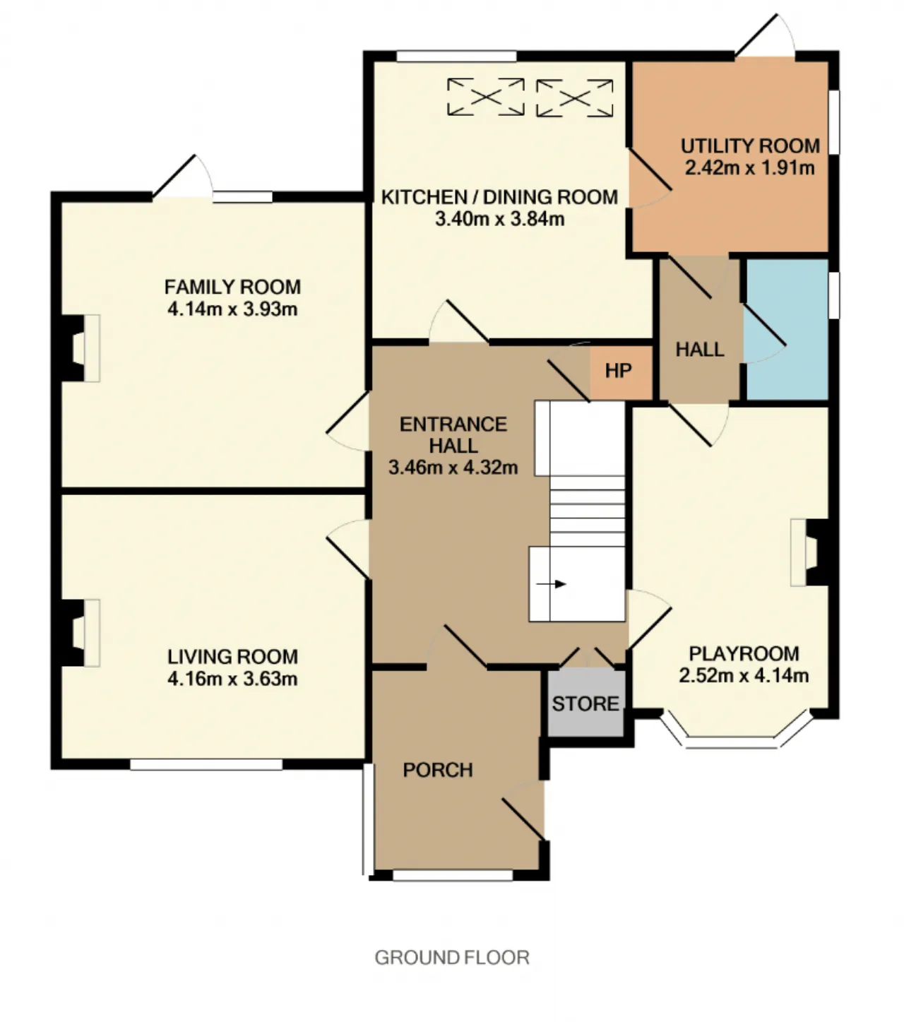 The ground floor is host to the porch, entrance hall, living room, family room, kitchen / dining room, utility room, shower room and playroom making this an ideal family home.